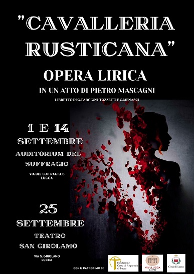 Domenica 1 settembre alle 21.15 all'auditorium del Suffragio andrà in scena per la prima volta a Lucca, la Cavalleria Rusticana, opera in un atto in forma scenica. Uno spettacolo sincero e commovente con un'azione scenica fluida e naturale : una fusione dell'opera lirica con il teatro drammatico, che rinnova l'esperienza scenica, anche attraverso l'intervento del regista di prosa, che ha introdotto alcune novità, come, ad esempio, il coinvolgimento nell'azione scenica dei bambini-attori. La produzione vanta un cast eccezionale: i protagonisti, coristi e i professori d'orchestra del prestigioso Teatro del Maggio Musicale Fiorentino e del Festival Puccini di Torre Del Lago. Dirigerà l'opera il maestro Mauro Fabbri.