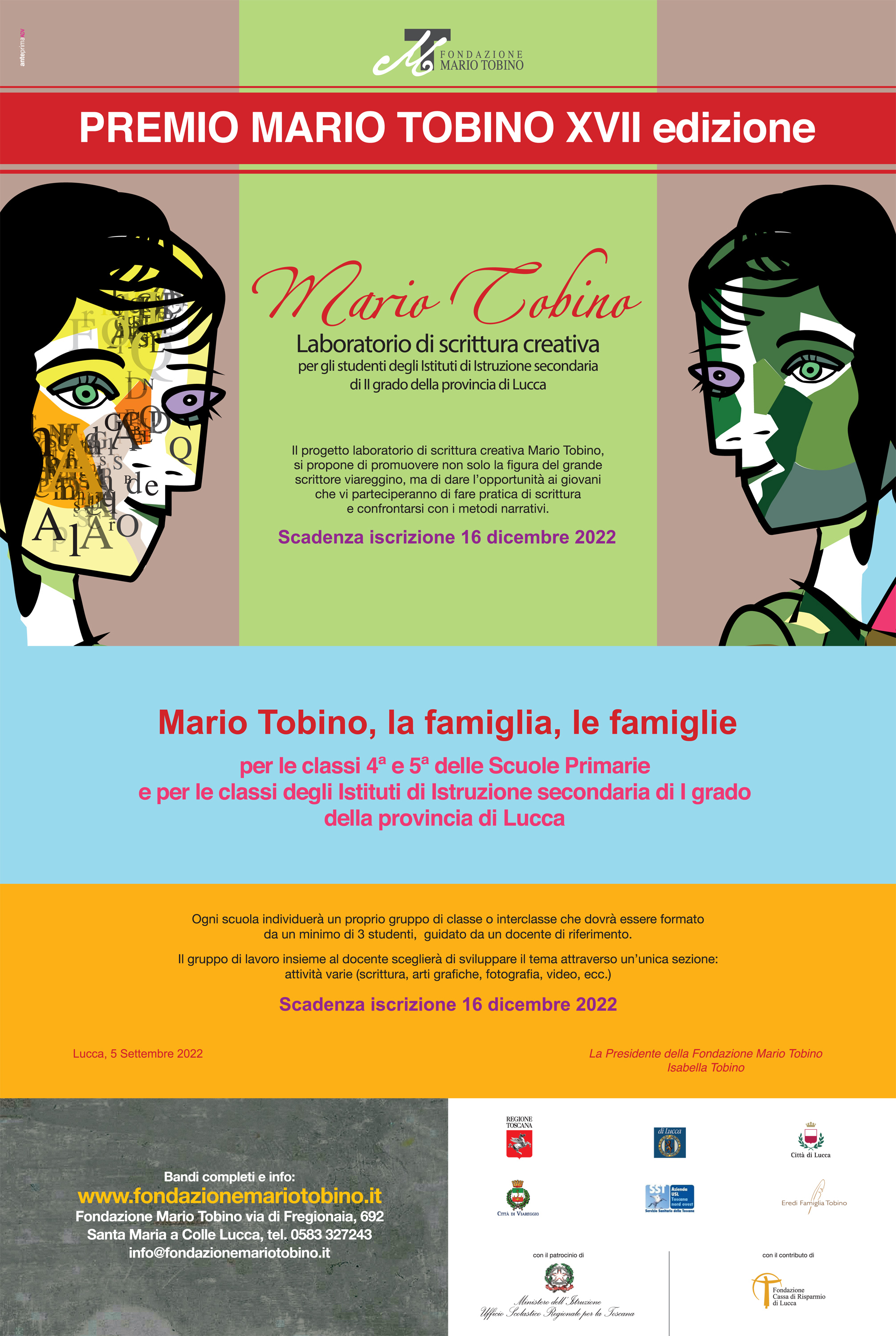 Agli studenti delle classi degli Istituti di istruzione secondaria di I grado e alle classi 4° e 5° delle Scuole Primarie della provincia di Lucca viene proposto di sviluppare un tema attraverso un'unica sezione con attività varie (scrittura, arti grafiche, fotografia, video, ecc.). Ogni scuola individua un proprio gruppo di classe o interclasse guidato da un docente di riferimento. Il tema di questa edizione è: Mario Tobino, la famiglia, le famiglie.