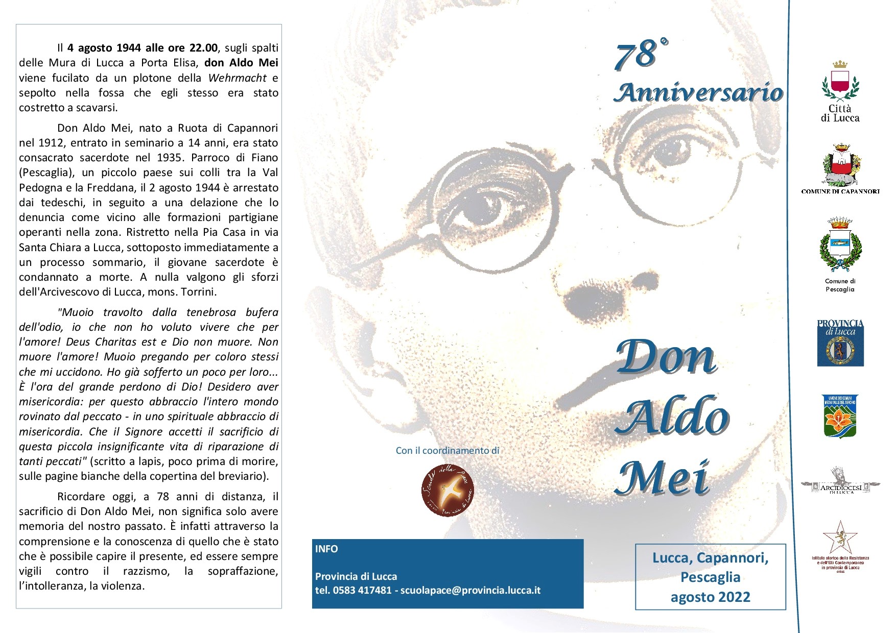 Ricorre giovedì 4 agosto il 78° anniversario della morte di Don Aldo Mei, il giovane sacerdote fucilato nel 1944 da un plotone della Wehrmacht sugli di spalti delle Mura di Lucca fuori porta Elisa.