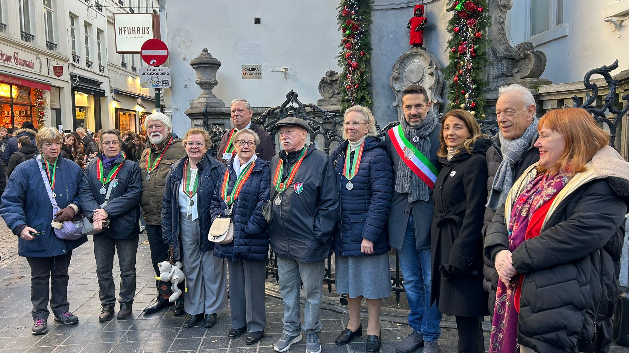 Si è svolta stamani (venerdì 29 novembre 2024) la vestizione di Manneken Pis, simbolo di Bruxelles, con il vestitino di Gianni Schicchi, donato dall'associazione nel 1994, e a seguire la deposizione di un omaggio floreale all'edificio in cui aveva sede la Clinica del dottor Ledaux, dove Puccini spirò un secolo fa, oggi. La cerimonia ha visto la presidente dell'associazione Lucchesi nel Mondo, Ilaria Del Bianco, insieme al sindaco di Pescaglia, Andrea Bonfanti, e alla direttrice artistica dell'associazione Vivien Hewitt, insieme ai rappresentanti dell'Ordre des Amis de Manneken-Pis (nelle foto).