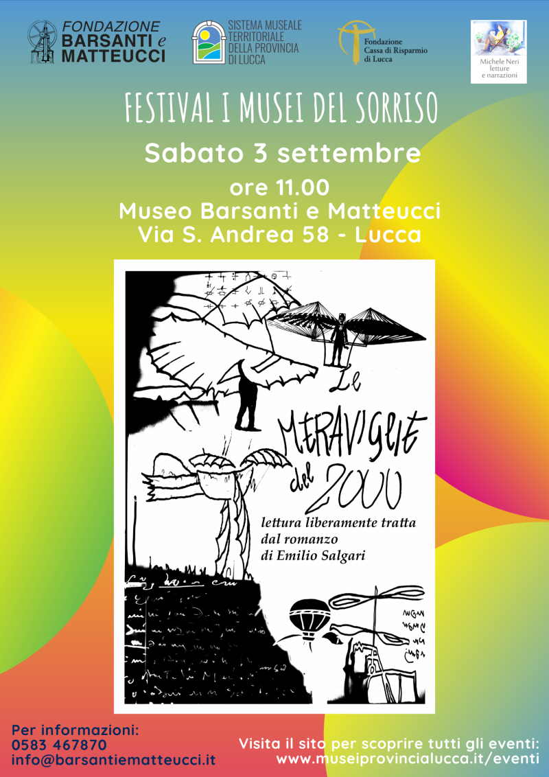 Alle 11 al Museo Barsanti e Matteucci di Lucca (via S. Andrea 58), nelle sale interne dove sono custodite le meravigliose invenzioni di padre Eugenio Barsanti e Felice Matteucci, in scena lo spettacolo "Le meraviglie del 2000", di Michele Neri, con una selezione dal testo di Emilio Salgari del 1907. L'unica opera di fantascienza scritta dal poliedrico autore padre di Sandokan, parla di uno scienziato il quale, coinvolgendo un giovane benestante ormai disilluso e annoiato dalla vita "normale", effettua un esperimento di viaggio nel tempo. Il nostro tempo. Si troveranno a viaggiare sul "Condor", una macchina volante a propulsione elettrica che permetterà di spostarsi alla favolosa velocità "di 150 chilometri all'ora". Gli episodi e lo stupore dei due protagonisti possono risultare estremamente divertenti al giorno d'oggi, proprio per la fantasiosa scrittura che ha generato situazioni, oggetti e personaggi abbastanza verosimili alla realtà odierna. Nel testo si racconta dello stato d'animo e dello sbigottimento rispetto ad una vita frenetica "elettrizzata" e velocissima, con ritmi inimmaginabili per un uomo della metà dell'Ottocento, ma che possiamo riscontrare nella vita convulsa e frenetica di cui oggi tutti ci lamentiamo.