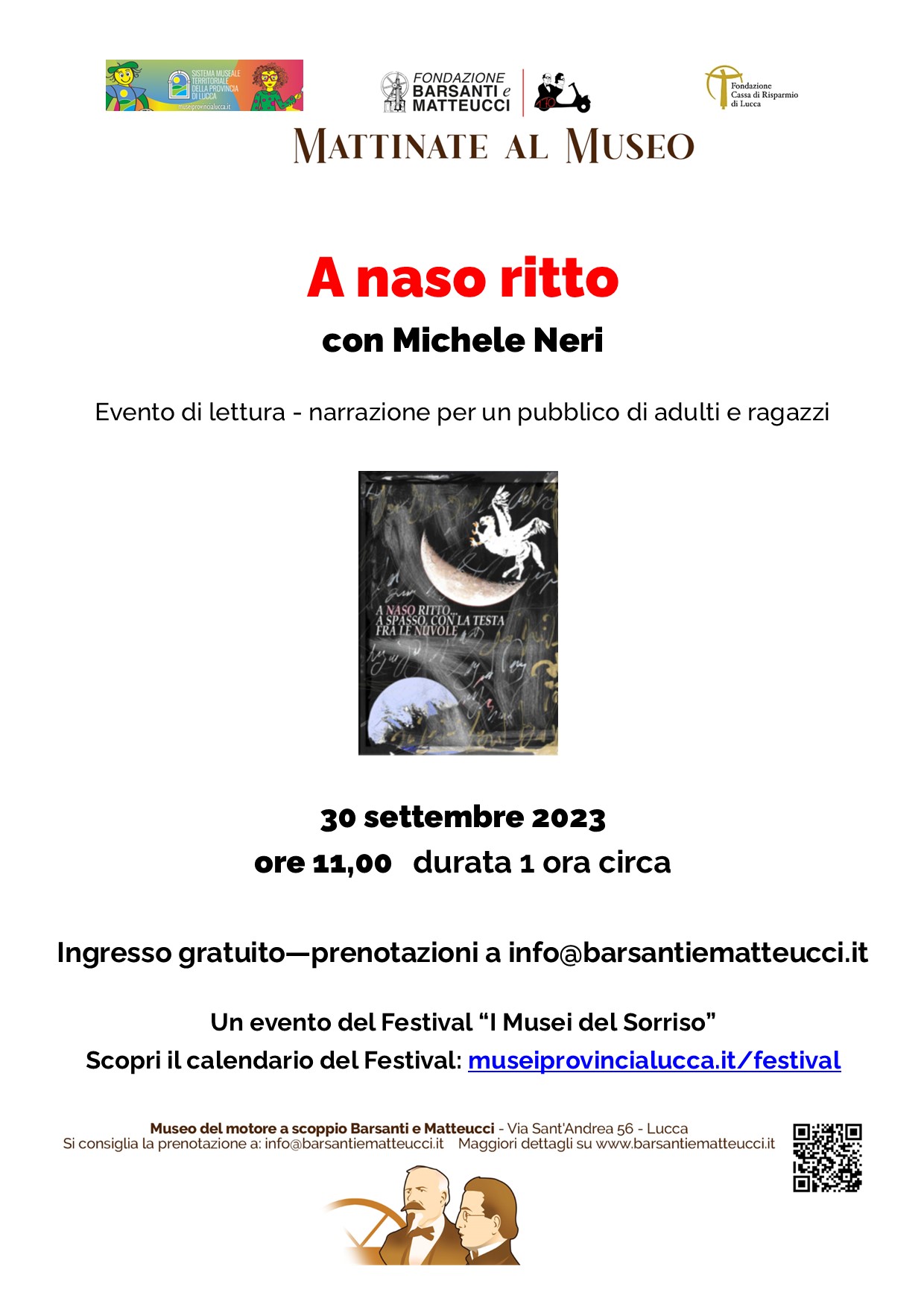 Il festival I Musei del Sorriso propone un nuovo appuntamento rivolto a un pubblico di adulti e ragazzi: un evento di lettura intitolato "A naso ritto", che si terrà sabato 30 settembre, alle 11, al Museo del Motore a scoppio "Barsanti e Matteucci" ubicato nell' Antica Loggetta dei Guinigi a Lucca, in via Sant'Andrea 58, a due passi dalla Torre Guinigi.
