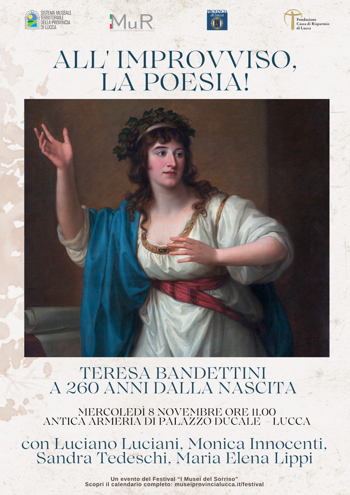 Un nuovo appuntamento letterario nel calendario del festival I Musei del Sorriso, mercoledì 8 novembre, alle 11, nell'Antica Armeria di Palazzo Ducale di Lucca: una celebrazione, a 260 anni dalla nascita (1763-2023), della poetessa lucchese Teresa Bandettini, donna dalle grandissime doti poetiche ma spesso dimenticata.