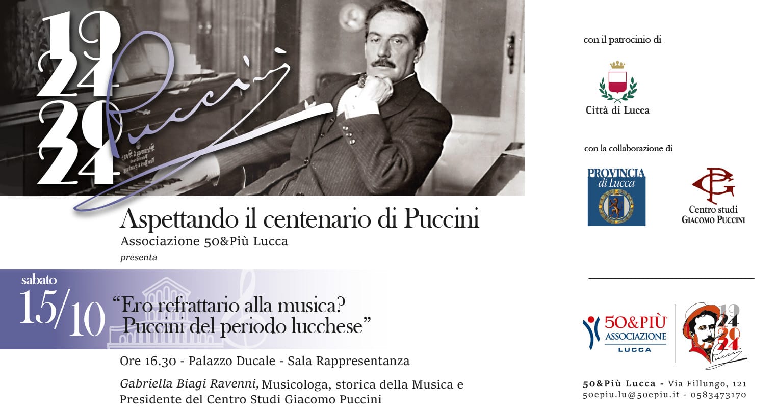 "Ero refrattario alla musica? Puccini del periodo lucchese". Questo il titolo, intrigante quanto provocatorio, dell'incontro culturale in programma sabato 15 ottobre, alle 16,30, nella sala Rappresentanza di Palazzo Ducale in cui la professoressa Gabriella Biagi Ravenni, tra i massimi esperti e conoscitori della figura dell'illustre musicista lucchese.