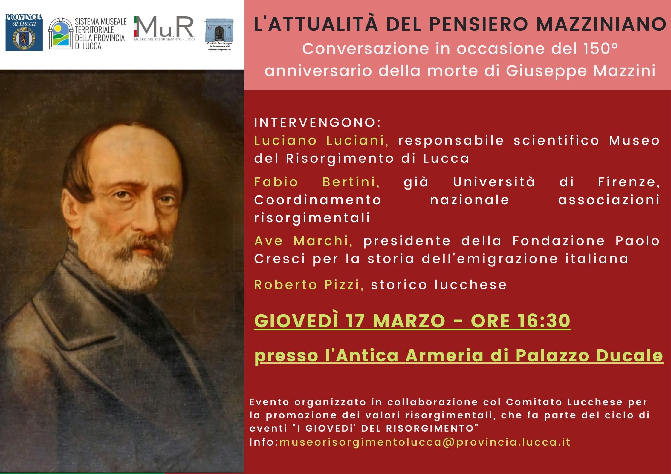 Quest'anno ricorre il centocinquantesimo anniversario della morte di Giuseppe Mazzini (1872-2022) e questo dà l'occasione per approfondire questa figura fondamentale per il Risorgimento. L'incontro infatti verte sul tema 'L'attualità del pensiero mazziniano. Conversazione in occasione del 150° anniversario della morte di Giuseppe Mazzini' e intervengono il responsabile scientifico del Museo del Risorgimento di Lucca, Luciano Luciani; Fabio Bertini già docente all'Università di Firenze e membro del Coordinamento nazionale associazioni risorgimentali; Ave Marchi, presidente della Fondazione Paolo Cresci per la Storia dell'emigrazione italiana e lo storico lucchese Roberto Pizzi.