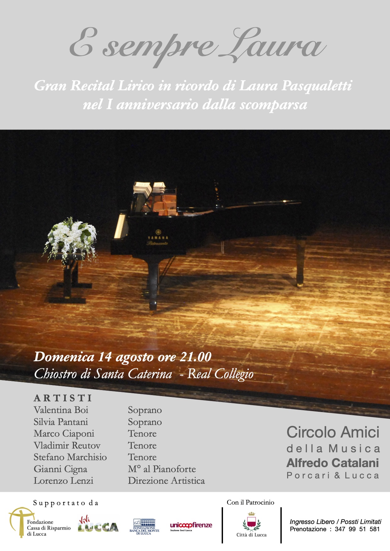 Domenica 14 agosto alle ore 21 il Circolo Amici della Musica Alfredo Catalani commemora con un Gala' lirico, nel chiostro di Santa Caterina presso il Real Collegio, la celebre pianista livornese Laura Pasqualetti, ad un anno esatto dalla sua scomparsa. Laura era parimenti stimata ed amata nella sua Livorno - città stretta nel cordoglio alla notizia della sua morte - e nella nostra Lucca, dove per lunghi anni aveva scandito con la sua arte gli eventi musicali più prestigiosi del Circolo Catalani stesso. Ma anche universalmente, ovunque la portarono le tappe della sua intensa attività concertistica, principalmente come accompagnatore di cantanti lirici: dalle grandi capitali europee al Giappone, agli Stati Uniti, a Cuba, in Siria, in Brasile e Argentina. Nel suo ineguagliabile curriculum professionale fa spicco la collaborazione continuativa col Maestro Riccardo Muti, come prediletta pianista assistente.Al concerto a lei dedicato "E sempre Laura" prendono parte volontariamente tutti artisti a lei legati da profonda amicizia: le soprano Valentina Boi e Silvia Pantani, i tenori Marco Ciaponi e Vladimir Reutov, il baritono Stefano Marchisio; al pianoforte il Maestro Gianni Cigna, presentazione a cura di Lorenzo Lenzi. L'ingresso è libero fino ad esaurimento dei posti, con prenotazione obbligatoria al n.347/9951581.