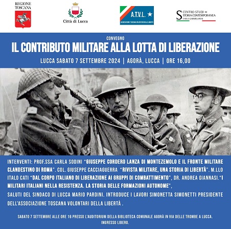 Sabato 7 settembre alle ore 16 presso l'auditorium della biblioteca comunale dell'Agorà a Lucca si terrà il convegno dal titolo "Il contributo militare alla lotta di Liberazione". Ne parleranno il Col. Giuseppe Cacciaguerra direttore di "Rivista Militare" Ministero della Difesa; la prof.ssa Carla Sodini, docente di Storia Militare all'Università di Firenze; il dr. Andrea Giannasi, direttore del Centro Studi di Storia Contemporanea "Carlo Gabrielli Rosi"; il p. Maresciallo Luogotenente (in q.) Italo Cati, già vicepresidente dell'Unirr, Unione nazionale italiana reduci di Russia.Dopo i saluti del sindaco di Lucca Mario Pardini, introduce i lavori il presidente dell'Associazione Toscana Volontari della Liberta Simonetta Simonetti.L'evento rientra nelle celebrazioni per gli 80 anni dalla Liberazione di Lucca curate dall'amministrazione comunale di Lucca e da ATVL.