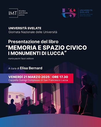 Dietro ogni monumento c'è una storia, invisibile agli occhi di chi guarda, ma carica di significato, che racconta di artisti, di committenti, di avvenimenti della città e della sua comunità. In occasione di "Università svelate", la Giornata nazionale delle università indetta dalla Crui (Conferenza dei Rettori delle Università italiane) che quest'anno si avvale della collaborazione di Anci (Associazione Nazionale Comuni Italiani), alla Scuola IMT si presenta il libro di Elisa Bernard, ricercatrice alla Scuola IMT, "Memoria e spazio civico". Il volume, edito da Maria Pacini Fazzi, rappresenta il primo numero della collana "Studi Lucchesi" diretta da Emanuele Pellegrini, professore in Storia dell'arte alla Scuola IMT. L'evento si tiene venerdì 21 marzo alle ore 17.30 nella Cappella Guinigi del Complesso di San Francesco. Realizzato grazie alla collaborazione di numerosi giovani studiosi della Scuola, il libro ha beneficiato del contributo della Fondazione Cassa di Risparmio di Lucca, del sostegno dell'amministrazione comunale e dell'Archivio Fotografico del Comune di Lucca.