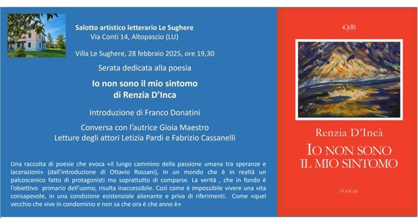 Esce la nuova raccolta poetica di Renzia D’Incà dal titolo Io non sono il mio sintomo (collana Fuochi diretta da Ottavio Rossani per I Quaderni del Bardo Edizioni di Stefano Donno) e si presenta presso il Salotto letterario Le Sughere – Villa Le Sughere via Conti 14, Altopascio (LU) il 28 febbraio 2025 alle ore 19,30. Introduce Franco Donatini. Dialoga con l’autrice Gioia Maestro. Letture a cura degli attori Letizia Pardi e Fabrizio Cassanelli. Renzia D’Incà con Io non sono il mio sintomo ha scritto una raccolta/specchio: una poesia dopo l’altra si vede e si sente passare un’esperienza complessa, inattesa e sofferente, ma anche sorprendente, drammatica, allegra, desiderata. Tuttavia, mentre l’autrice si guarda, controlla, constata, non c’è certezza che l’apparenza sia sostanza. Le parole affermano una verità, ma gli occhi e i suoni subito, insieme, la mettono in dubbio, e in certi momenti la contestano. Le variazioni sono inseguite, e mai risolutive. Sembra un gioco del dire e del dubitare, in realtà è l’analisi dello scompenso tra realtà e finzione. L’Io si espone, e subito dopo si nega. Sembrerebbe tutto semplice, ma il gioco diventa ossessione. La ricerca della verità, che in fondo è l’obiettivo primario, risulta impossibile. La verità c’è, ma non è identificabile nella trasposizione. Le direttrici sono due : una esterna, evidente, l’altra parallela e sottostante, appena percettibile ma invisibile. L’autrice sperimenta un doppio linguaggio: la linea del sentimento è nello stesso tempo, in un percorso collaterale, anche la sua negazione, inconsapevole, però sull’onda della volontà di conoscere l’invisibile. 6 Ricchezza di metafore, similitudini, interrogativi, immagini disvelatrici che subito affondano nell’inconoscibile. La lingua è seria, sciolta, spontanea, ma non improvvisata. E accanto scorre una seconda visione che vorrebbe sconvolgere gli equilibri espressivi. I temi sono molti, i momenti sono folgorazioni dubitative, e quando invece sono determinative subito si ammantano di una duplice ipotetica significanza. Un sottopensiero continuo accompagna le visioni: il senso indeterminato di Ermete Trismegisto, segnalato in esergo, con i “miracoli della realtà”, cioè il misterico mondo dei possibili. Il racconto è multiplo: le direzioni talvolta si incrociano, ma altre volte corrono parallele e si mimetizzano. Il tempo è indeterminato, le età si rincorrono. La vecchiaia è in attesa di farsi scoprire, la natalità è incerta, e la vita può anche essere arte. La speranza che nulla finisca è umiliata dal vuoto che appare e sembra sconvolgere tutto nell’indifferenza. La malìa della casa, nel rischio dispotico e nella necessità del sogno. I ricordi sono vita contraddittoria. Versi storici appaiono agli occhi, senza risolvere alcunché. Un certo fatalismo condiziona i desideri. Nella casa dominano i gatti. Il mondo è un palcoscenico, ci sono protagonisti e comparse. E la morte è lì, presente, ancora non attiva, ma agisce altrove. Uomini e donne non sanno convivere tra cattiveria e ipocrisia. Il panorama dantesco aiuta o inquieta? Forse le bestie sono come gli umani? Ma gli umani forse sono disumani (ricordiamo l’ironico 7 “peggior appiglio” del grande Boccaccio attribuito all’uomo che comunque può vedere e scegliere sempre il possibile “meglio”?), e bisogna guardarsi da loro. La natura è buona? Forse. Non è dimostrabile. Uccelli, corvi, e immigrati clandestini. Stragi, Torri Gemelle. I mici aspettano, sensibili. E non capiscono le persone inumane. Rabbia e passione. Le cicale sono sconce. Il mondo presenta bagni di sangue. Paesaggi indomiti e duri (la Maremma è centrale). ‘‘Ordinario furore” delle domande (a Dio?). Aggrapparsi al centro del desiderio. Dove si può andare? C’è una chiave per volare? Si vive nel teatro del malcontento. E all’improvviso il Covid che costringe a stare insieme (non bene) in casa: e i morti sono gratis. Stranezze sì, ma umanità, prego. Ascoltare De André. I controlli di polizia. Essere sposa “del proprio niente”. L’inconscio imperversa. Difficile rivelare segreti. I corpi si espongono e subiscono. Bisogna dare nome al dolore, “ai profughi alla porta”. Un nome alla vita. Attenti, c’è sempre un invasore. Scendere dal cloud, incontrare il corpo, e le città nel mondo, ma non su Facebook. Le radio spiegano, raccontano. Ballare il valzer. Ricordare i lager. “Basta, guerriero”, riposati. Festival del corpo. E viene la Parola: rivela qualcosa? Eden e redenzione, chi sa?. E amore, fatto di parole, da inseguire. Rammentare Firenze, Vasari, Stendhal, Schubert. Andare in orbita, e poi un “diverso amplesso”. Parole pesanti, parole di amanti. Ci vuole lungimiranza. Melodia per una gatta. Alla fine del lungo cammino c’è l’Oroboro, si può rinascere? Dunque, “ascoltare la parola innamorata”. 8 Una scrittura coraggiosa. Multicolore e multistupore. Rime baciate, assonanze continue, selezione delle parole che incantano o distolgono. Un’attesa non sillabata, ma auspicata. Una felicità composta, leggera, nascosta. Appare anche la malinconia, e la solitudine, e la follia umana che insegue i valori e perde la strada. Un’ammonizione per un futuro migliore. Qualcuno ascolterà, forse, la “parola innamorata”.