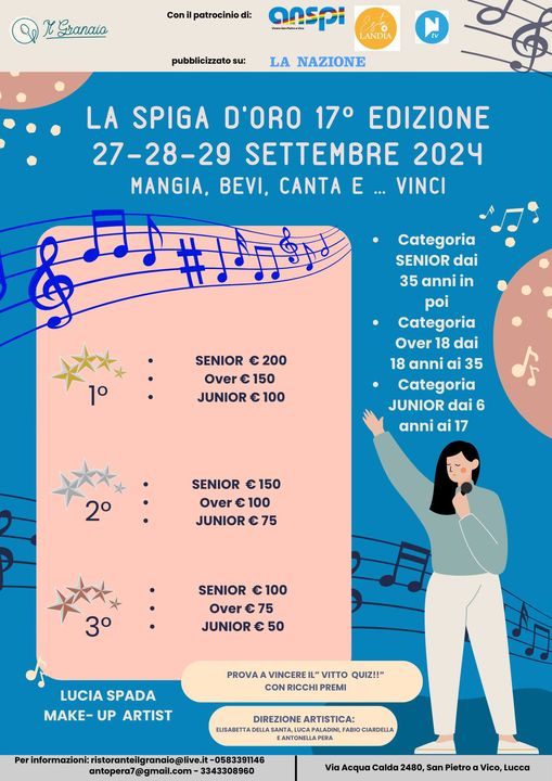 Iscrizioni aperte per il contest canoro "La Spiga d'oro", rivolto ai cantanti di tutte le età, le cui selezioni si terranno nei giorni 27 e 28 settembre e la finale domenica 29 settembre.