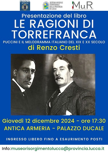 La prima stroncatura dell'uomo e dell'opera di Puccini in "Le ragioni di Torrefranca. Puccini e il melodramma italiano del XIX e XX secolo". La presentazione del libro di Renzo Cresti prosegue l'anno delle celebrazioni pucciniane e il calendario della terza edizione del festival "I Musei del Sorriso", organizzato dal Sistema Museale Territoriale della Provincia di Lucca con il sostegno della Fondazione Cassa di Risparmio di Lucca, con un appuntamento giovedì 12 dicembre 2024 alle 17,30 nell'antica armeria di Palazzo Ducale.