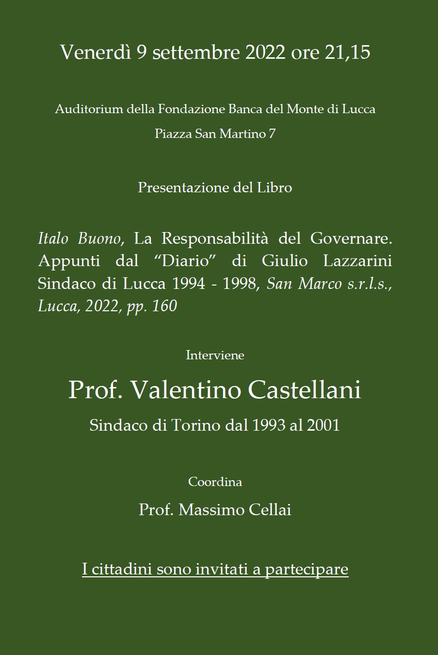 Venerdì 9 settembre alle 21.15 nell’auditorium della Fondazione Banca del Monte di Lucca in piazza San Martino 7, il professore Valentino Castellani, sindaco di Torino dal 1993 al 2001, presenterà il libro di Italo Buono “La responsabilità del governare. Appunti dal “Diario” di Giulio Lazzarini, sindaco di Lucca 1994 – 1998”. Intervengono Italo Buono, Alberto Del Carlo, coordina Massimo Cellai.