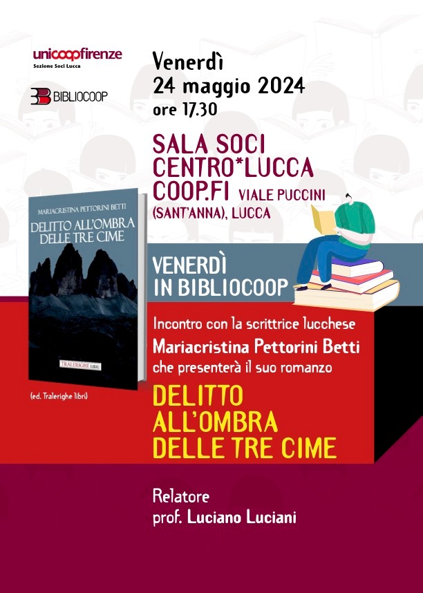 Venerdì (24 maggio) alle 17,30 nella sezione Soci Coop in viale Giacomo Puccini a Lucca sarà presentato il romanzo poliziesco di Mariacristina Pettorini Betti, Delitto all’ombra delle Tre Cime, Tralerighe libri, 2023. Luciano Luciani dialogherà con l’autrice. Maria Cristina Pettorini Betti, docente e dirigente scolastica, vive da quasi quarant’anni a Lucca. Da sempre lettrice appassionata di letteratura d’indagine, negli ultimi due anni si è anche cimentata con la scrittura, realizzando due romanzi: Delitto all’ombra delle Tre Cime 2023 e L’enigma del capitano dell’Aphrodite, 2024, l’uno e l’altro pubblicati da Tralerighe libri. Suo protagonista seriale, il commissario capo della polizia di stato Manfred Biasini, in forza alla squadra mobile della questura di Bolzano, ma di conclamate e orgogliose origini lucchesi. Eroe indagatore d’impianto tradizionale, Biasini raccoglie informazioni, interroga i testimoni, procede a rigorose e sistematiche verifiche. E, se all’inizio la polizia brancola nel buio, al termine dell’inchiesta il colpevole non potrà sfuggire alle maglie della giustizia. L’ingresso è libero.