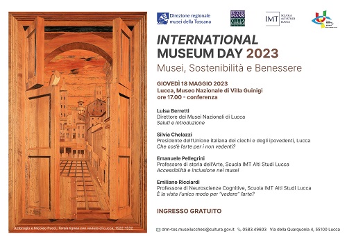 Giovedì 18 maggio alle ore 17.00, presso il Museo nazionale di Villa Guinigi, si terrà la conferenza INTERNATIONAL MUSEUM DAY 2023. Musei, Sostenibilità e Benessere, un’occasione per sensibilizzare il pubblico alla promozione dell’inclusività, uno dei risultati che si dovrebbe raggiungere a lungo termine secondo la Risoluzione ICOM (International Council of Museum) “Sulla sostenibilità e l’attuazione dell’Agenda 2030, trasformare il nostro mondo” (Kyoto, 2019), secondo la quale tutti i musei svolgono un ruolo nel modellare e realizzare futuri sostenibili e possono farlo tramite programmi educativi, mostre, sensibilizzazione della comunità e ricerca. Dopo i saluti e l’introduzione alla tematica della conferenza da parte di Luisa Berretti, Direttore del museo, parlerà Silvia Chelazzi, presidente dell'Unione Italiana dei ciechi e degli ipovedenti di Lucca, con un intervento intitolato Che cos’è l’arte per i non vedenti?. A questo, seguirà Emanuele Pellegrini, professore di storia dell'arte, Scuola IMT Alti Studi Lucca, che affronterà l’argomento dell’Accessibilità e inclusione nei musei partendo dalla nuova definizione di “museo” secondo l’ICOM (2022), e infine, Emiliano Ricciardi, professore di neuroscienze cognitive, Scuola IMT Alti Studi Lucca, delineerà le linee di ricerca più ampie che il gruppo di ricerca dell’università sta conducendo sul cervello del non vedente e sugli spunti che queste conoscenze possono fornire a chi dovrà rendere accessibile la fruizione dell’arte. Ingresso gratuito.