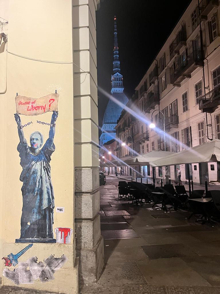 L’ultimo suo ‘pezzo’ è apparso su un muro in via Po’, in centro a Torino, proprio all’angolo con via Montebello. Una moderna statua della libertà con la testa di Julian Assange, che sorregge un’interrogativa dichiarazione scritta in rosso (vernice o sangue?) con le catene spezzate e la torcia infuocata ai piedi mentre brucia la carta stampata.