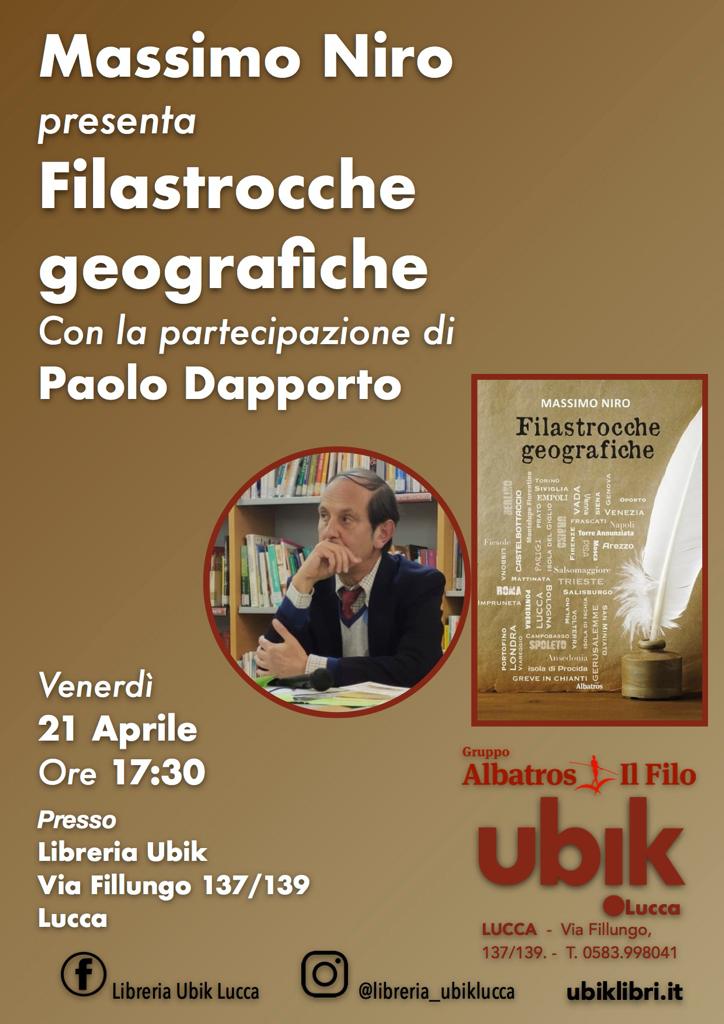 Venerdì 21 Aprile ore 17.30, presso la libreria Ubik Lucca, si terrà la presentazione del nuovo libro di Massimo Niro, "Filastrocche geografiche" (Gruppo Albatros Il Filo). Con la partecipazione di Paolo Dapporto. "Ci sembra di vederlo questo "paesaggio umano", così vario, sfaccettato, intrigante, quasi stordente; ci fa immaginare anche quest'uomo, il nostro autore, con le sue mille vite vissute dietro a quella da tutti conosciuta, perché a volte il noi che proiettiamo in un'esperienza, in un luogo visitato, è quello di quel momento, un attimo che si materializza per la necessità di esserci, esistere, permanere."