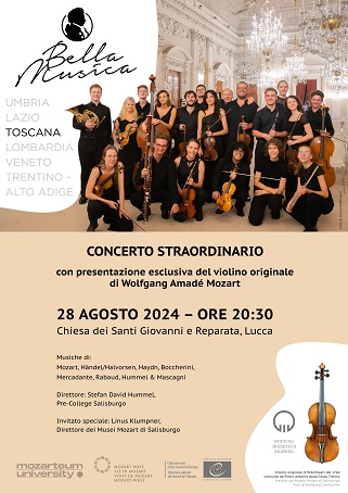 Mercoledì 28 agosto alle ore 20.30 alla chiesa dei Santi Giovanni e Reparata il violino originale di Mozart del 1764. Ingresso gratuito. Dal 2011 il progetto musicale Bella Musica riunisce giovani artisti di tutta Europa per rivitalizzare il patrimonio culturale europeo e costruire un ponte tra le culture attraverso la musica. Quella che era nata come un'iniziativa italo-austriaca si è ora sviluppata in un ensemble europeo che porta lo spirito di Wolfgang Amadé Mozart fino ai giorni nostri. Siamo particolarmente orgogliosi del ruolo dei nostri musicisti come “Giovani Ambasciatori delle Vie Mozartiane Europee”, che ogni anno viaggiano sulle orme di Mozart e promuovono il dialogo interculturale. In collaborazione con la Fondazione Internazionale Mozarteum, presentiamo il violino originale di Mozart del 1764, costruito da Pietro Antonio dalla Costa. Presentazione: Linus Klumpner (Direttore del Museo Mozart di Salisburgo)