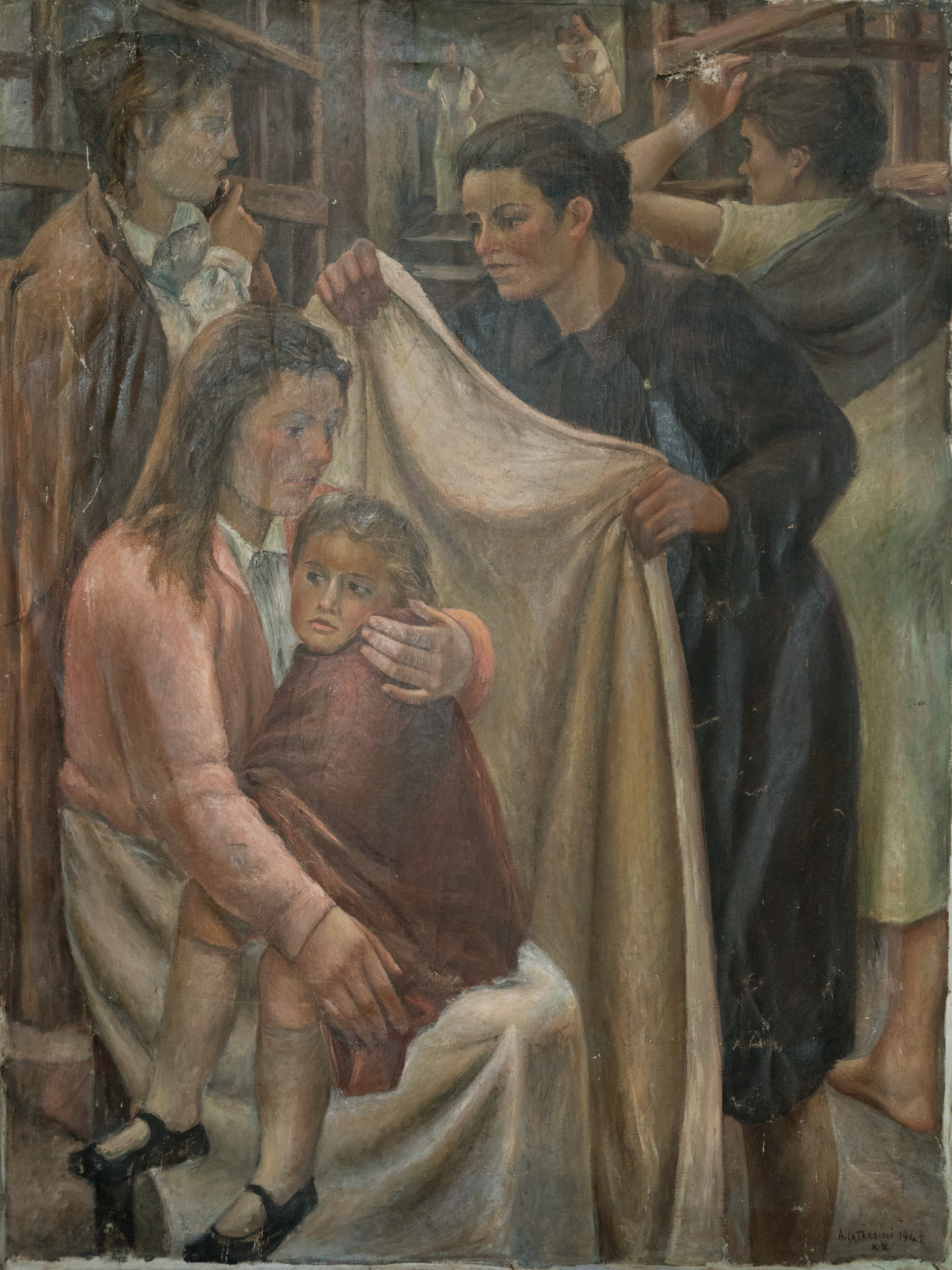 (Nella foto in alto: A. Catarsini, Donne nel rifugio antiaereo, bozzetto a olio, 60 x 46 cm, Collezione privata; l'opera finita è attualmente in restauro)