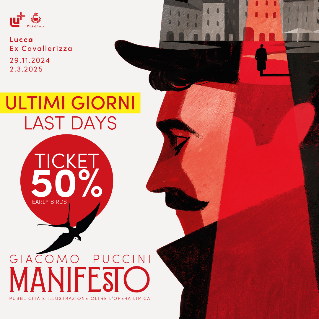 Sta per terminare l'offerta per i biglietti scontati del 50% per la mostra "Giacomo Puccini Manifesto. Pubblicità e illustrazione oltre l'opera lirica", in programma a Lucca dal 29 novembre 2024 al 2 marzo 2025, presso la Ex Cavallerizza di piazzale Verdi.