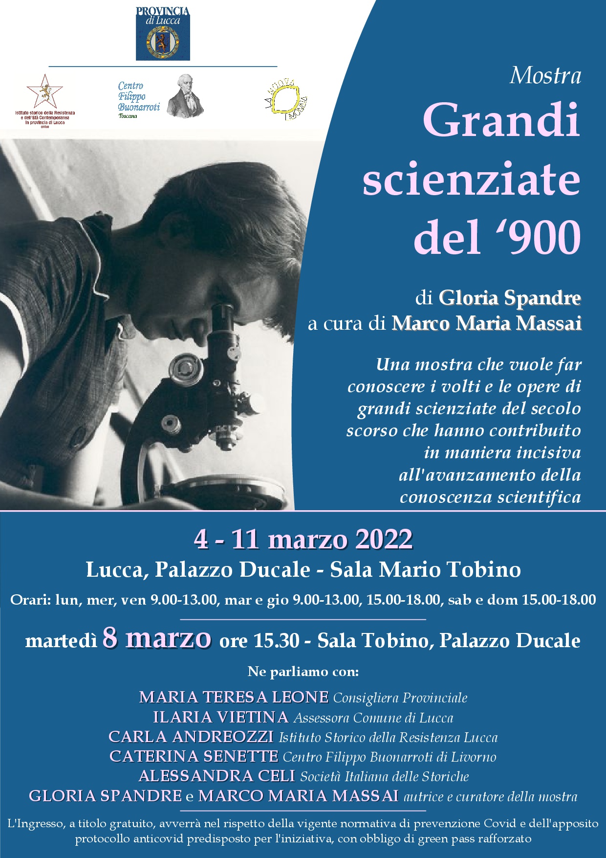 Le donne che hanno dedicato la loro vita alla scienza sono le protagoniste della mostra – allestita a Palazzo Ducale - «Grandi scienziate del '900» di Gloria Spandre e curata da Marco Maria Massai, che inaugura il 4 marzo e resta visitabile fino all'11, nella Sala Tobino.