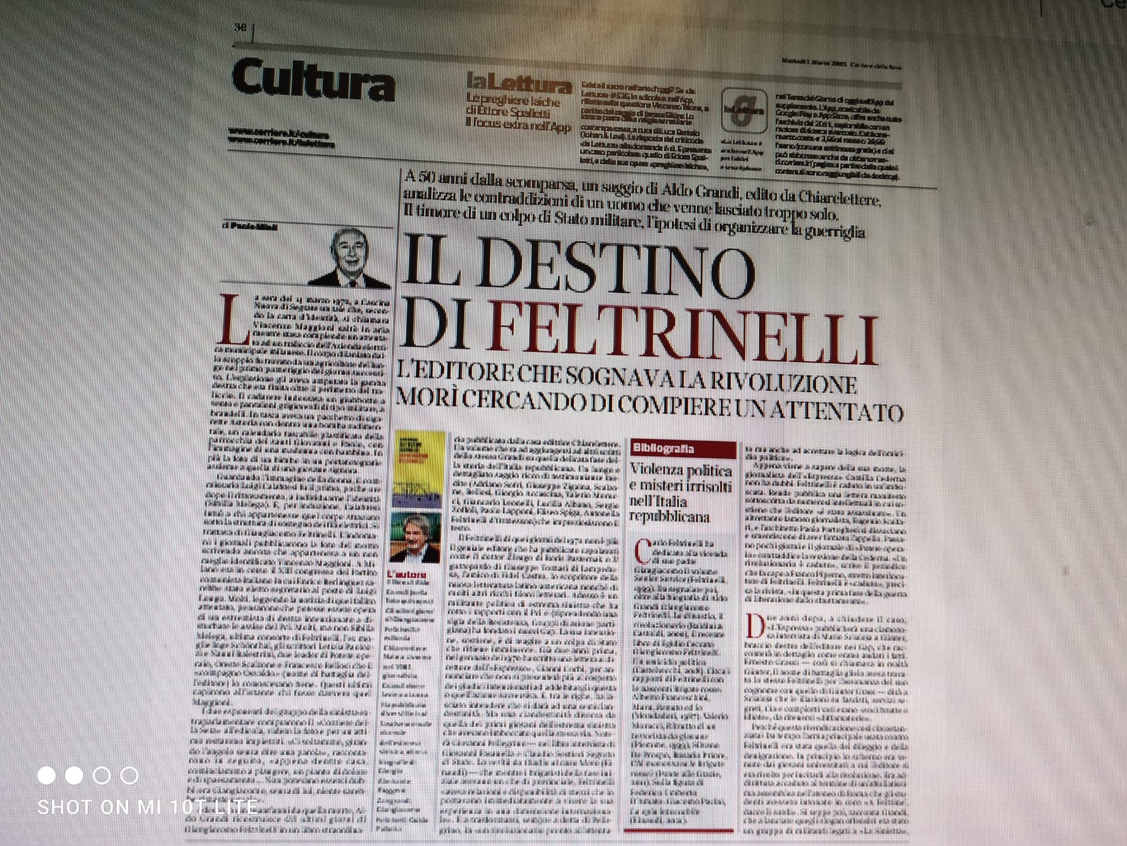 Due pagine sul Corriere della Sera dii oggi a firma Paolo Mieli. 'Un libro straordinario' secondo lo storico e giornalista noto volto televisivo e firma prestigiosa del quotidiano meneghino. Oggetto della recensione l'ultimo libro di Aldo Grandi, Gli ultimi giorni di Giangiacomo Feltrinelli, edito da Chiarelettere e dal 24 febbraio in libreria. Mieli, che all'epoca era giovanissimo collaboratore de L'Espresso e militante di Potere Operaio, ripercorre la vita dell'editore morto su un traliccio a Segrate la sera del 14 marzo 1972 e per il quale ricorrono i cinquant'anni dalla scomparsa.