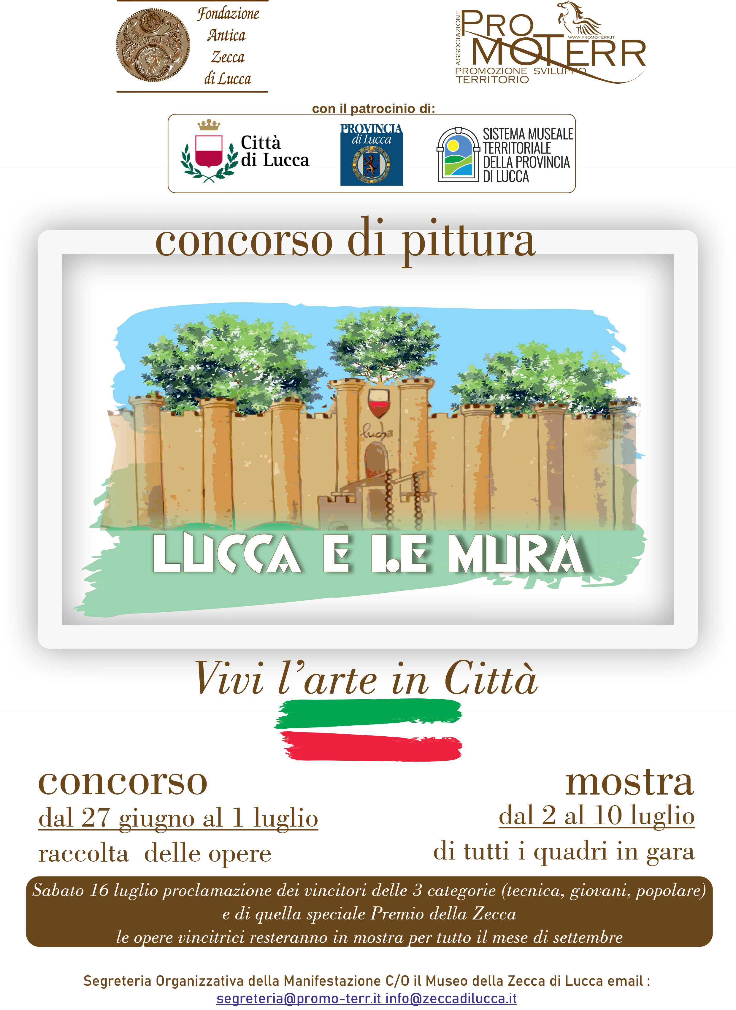 Pubblicato il bando per il concorso di pittura “Lucca e le Mura” organizzato dalla Fondazione Antica Zecca di Lucca e dall’Associazione Promo-Terr con i patrocini del comune di Lucca, della Provincia di Lucca e del Sistema Museale Territoriale della Provincia di Lucca.