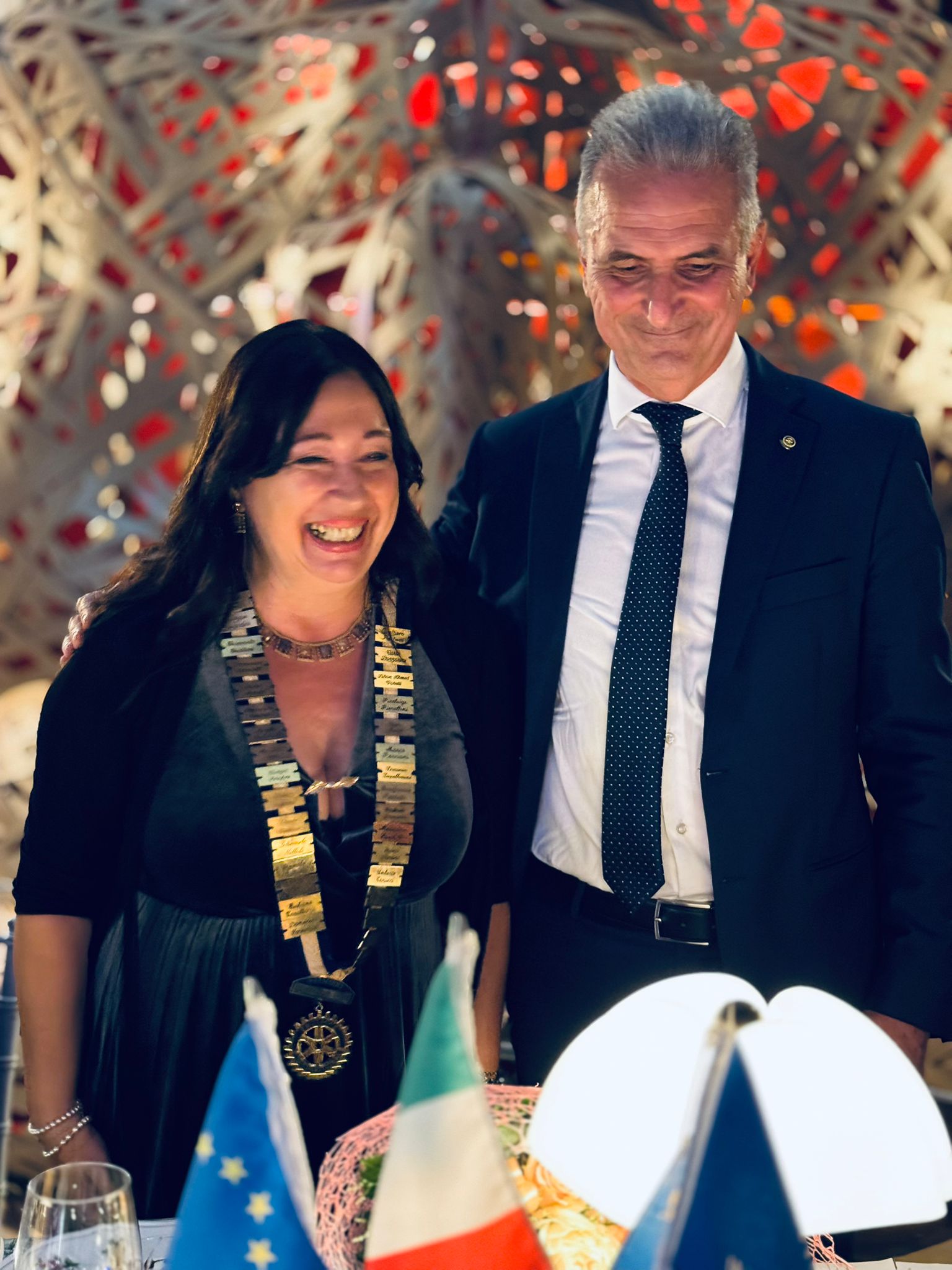 Successivamente ha presentato un resoconto dell'attività svolta dal Club nell'annata, dichiarando la sua soddisfazione per i quattordici services realizzati, che hanno spaziato dalla attenzione all'ambiente con il completamento della rialberatura del Baluardo San Salvatore, a quella verso i più fragili, con la donazione di un cane guida per ciechi, di uno scooter elettrico al Comune per turisti con difficoltà di deambulazione, oltre che alla cultura, con il restauro di pergamene longobarde custodite dalla Curia lucchese, nonché interventi preventivi come il cane antidroga e il defibrillatore installato nella nuova palestra della Cavallerizza. Il Presidente ha concluso il suo intervento ponendo l'accento sull'apporto dell'importante e costante contributo fornito dal Consiglio Direttivo, dalle Commissioni , ma anche da diversi soci che ha nominato e ringraziato. Al termine dell'intervento il Presidente Lunardini si è sfilato il collare per passarlo alla nuova Presidente Elisabetta Abela, tra gli applausi dei presenti.