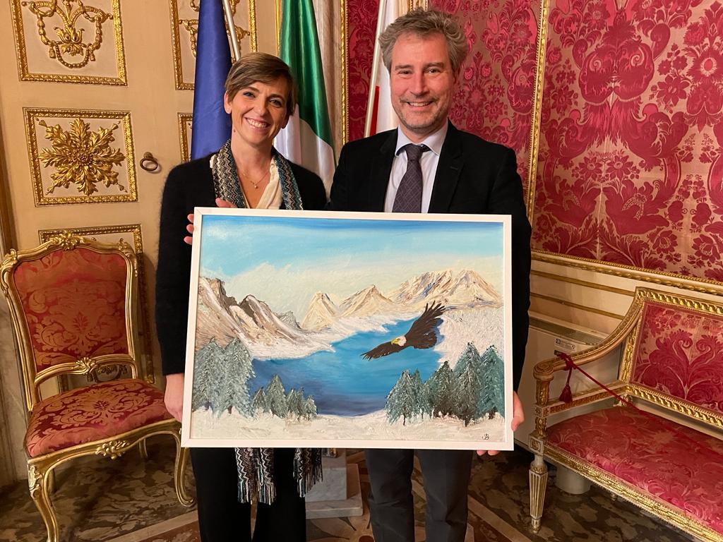 Il primo cittadino ha ricevuto la coppia nella sua stanza a palazzo dei Bradipi (già Orsetti) e ha anche ricevuto in dono dalla pittrice, un quadro intitolato Freedom. Bettaccini è anche presidente dell'associazione Ucai (Unione Cattolica Artisti Italiani).