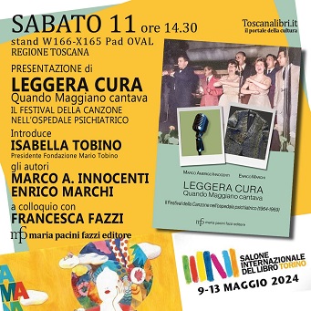 Sbarca al “Salone del Libro” in corso a Torino il libro “Leggera Cura – Quando Maggiano cantava”, scritto dallo psichiatra Enrico Marchi e dal giornalista Marco Amerigo Innocenti. Sabato 11 maggio alle 14,30, nello stand della Regione Toscana, il portale della cultura Toscanalibri.it, Francesca Fazzi della casa Mpf che edita il libro, Isabella Tobino, presidente della Fondazione Mario Tobino presentano il saggio che riscopre il Festival della Canzone dentro l’ospedale psichiatrico di Maggiano, seguito per sei anni, dal 1964 al 1969, da un pubblico più ampio - fino a tremila persone - di quello di Sanremo. A scrivere le canzoni, cantare e suonare sul palco erano i degenti dell’ex ospedale, aiutati e coordinati da alcuni operatori della struttura. Documenti, immagini, filmati, audio e testimonianze sono state ritrovate e raccolte nel libro. Il lettore trova nel testo i QRCode attraverso i quali ascoltare e vedere con immediatezza le canzoni eseguite dai pazienti e le immagini della presentazione e dello svolgimento del Festival.