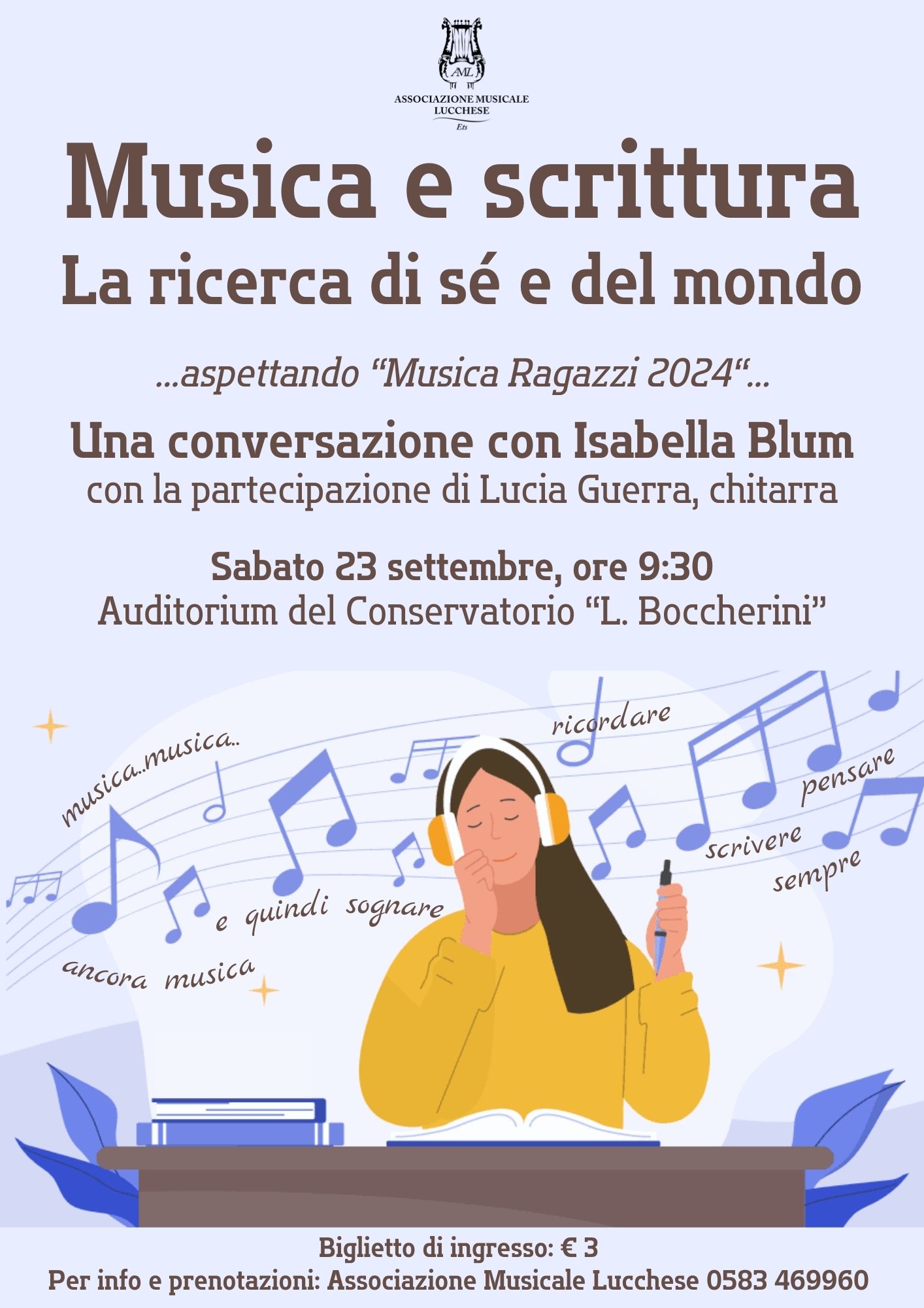 Nell'intento degli organizzatori, la conferenza è un'anteprima di Musica Ragazzi, la stagione curata da Carla Nolledi che l'Associazione Musicale Lucchese dedica alle nuove generazioni per avvicinarle al mondo della musica, che è fatto di ascolto consapevole, di conoscenza dei processi compositivi e di collegamenti con tante altre discipline. Verrà proposto quindi l'avvio di un laboratorio nel quale approfondire il tema della parola scritta – in particolare concentrato sulla scrittura autobiografica e sulla scrittura naturalistica – come prezioso strumento per la conoscenza di sé e del mondo.