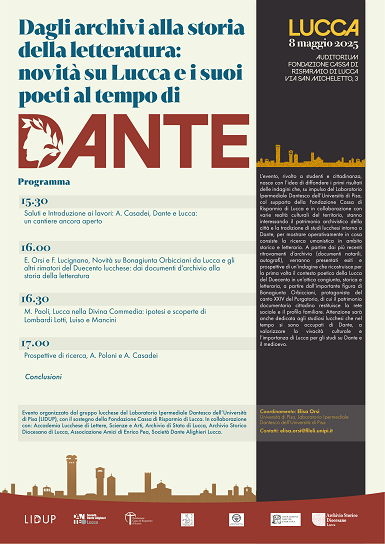 La scoperta è il primo significativo risultato del progetto promosso dalla Fondazione Cassa di Risparmio di Lucca, Poeti nella Lucca del Duecento. Primi scavi per una nuova valorizzazione di identità ed eredità della cultura cittadina prima di Dante, che indaga il patrimonio dell’Archivio di Stato e dell’Archivio Storico Diocesano di Lucca. Grazie a un innovativo approccio interdisciplinare, il progetto mira a realizzare la prima ricostruzione complessiva del panorama poetico della Lucca del Duecento, tracciando un profilo storico-letterario, sociale e familiare dei suoi protagonisti, a partire dall’importante figura di Bonagiunta. Al focus sui poeti del Duecento lucchese, nel corso dell’evento, si affiancherà un approfondimento sugli studiosi locali che di Dante si sono occupati, per valorizzare appieno la vivacità culturale e l’importanza di Lucca per gli studi su Dante e sul Medioevo.