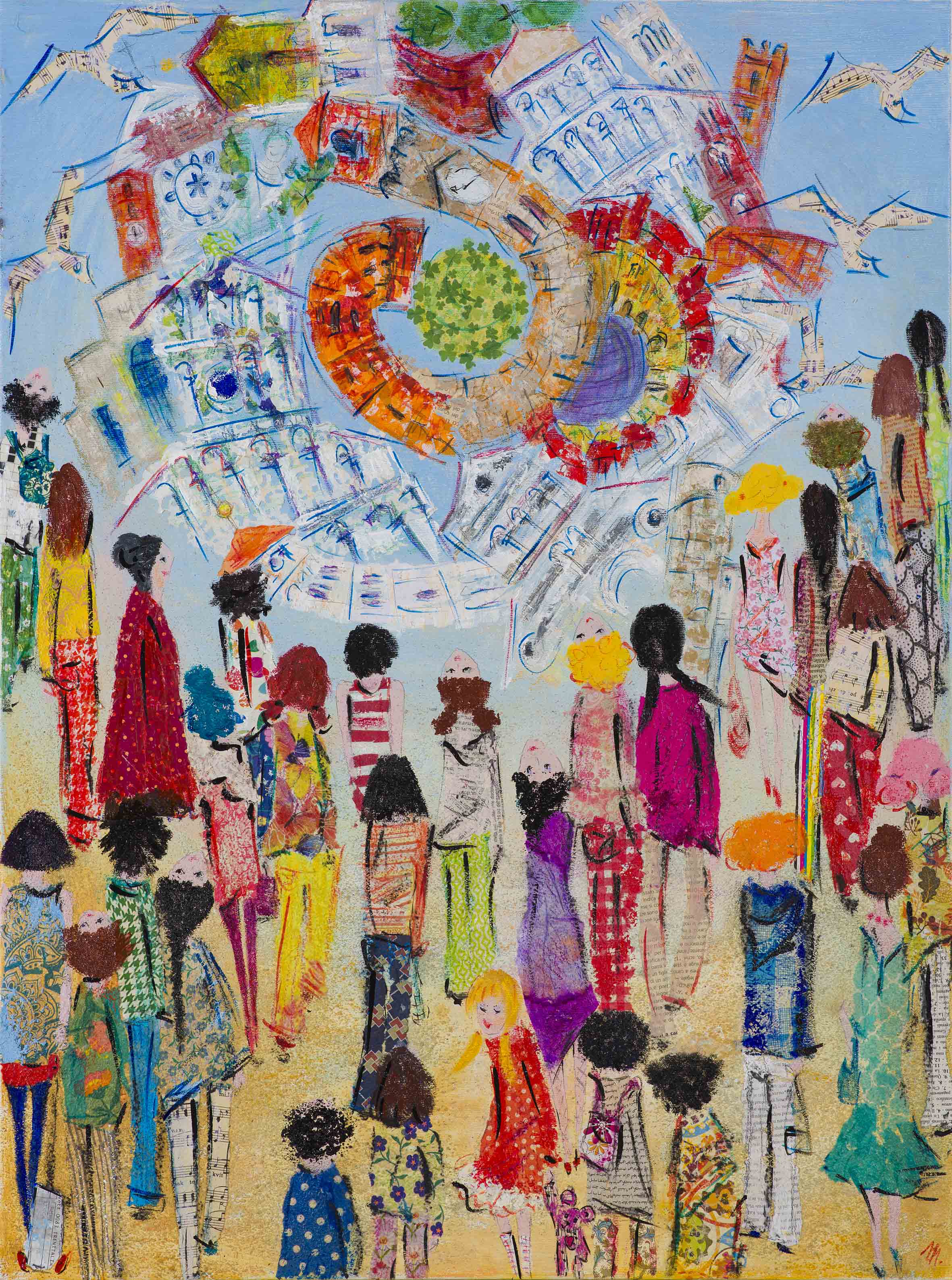 Nella sua pittura si fa tangibile lo stream of consciusness della sua fantasia: quel libero flusso creativo che porta i bambini a fare il bagno dentro una piazza, gli animali a rotolare sopra i tetti sospinti dal vento, gli uccelli in volo a proteggersi dalla pioggia con tanti ombrelli colorati.