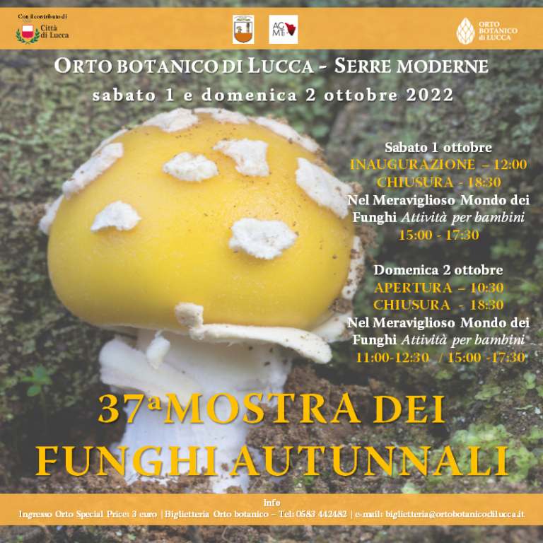 Sabato 1 e domenica 2 ottobre, le Serre moderne dell’Orto botanico ospiteranno la 37° edizione della Mostra dei funghi autunnali realizzata a cura del Gruppo Micologico e Naturalistico Lucchese ‘Benedetto Puccinelli’.