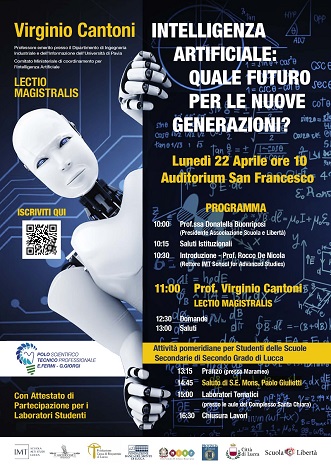 Il prof. Virginio Cantoni è uno dei massimi esperti del settore, ha un ricco curriculum e fa parte della Commissione Statale sugli Algoritmi. Lui ci spiegherà in sintesi il contenuto della normativa Europea e vorrà allertare i giovani che dovranno confrontarsi con l' Intelligenza Artificiale in tutti i settori della vita umana. Sarà dunque necessario dare loro le linee guida con un risvolto filosofico ed etico della grande e imprescindibile opportunità. Il prof. V. Cantoni sarà presentato dal Rettore Rocco De Nicola della Scuola IMT Alti Studi Lucca.