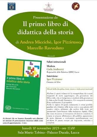 Cambia prospettiva la didattica della Storia. Un cambio di prospettiva necessario e legato alla generazione di insegnanti e a quella degli studenti. Questo è il tema dell'incontro in programma in Sala Mario Tobino a Palazzo Ducalelunedì 10 novembre, a partire dalle ore 17, quando sarà presentato il volume «Il primo libro di didattica della storia» di Andrea Miccichè, Igor Pizzirusso e Marcello Ravveduto (ed. Einaudi). L'incontro è stato organizzato dalla Scuola per la Pace della Provincia di Lucca e dall'Istituto storico della Resistenza e dell'Età contemporanea di Lucca.