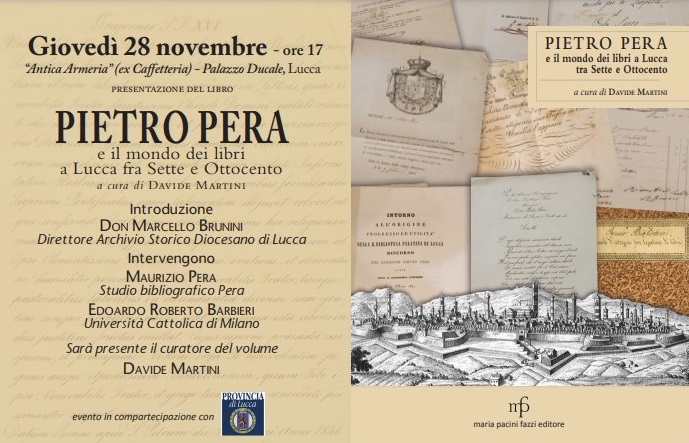 Nel quadro di tali iniziative rientra la presentazione, il giorno 28 novembre alle h.17,00 presso l’Antica Armeria (ex Caffetteria) di Palazzo Ducale, del volume “Pietro Pera e il mondo dei libri a Lucca fra Settecento e Ottocento”, a cura di Davide Martini, edito da Maria Pacini Fazzi e predisposto dalla Università Cattolica di Milano, oltre alla apertura del nuovo sito web della libreria.