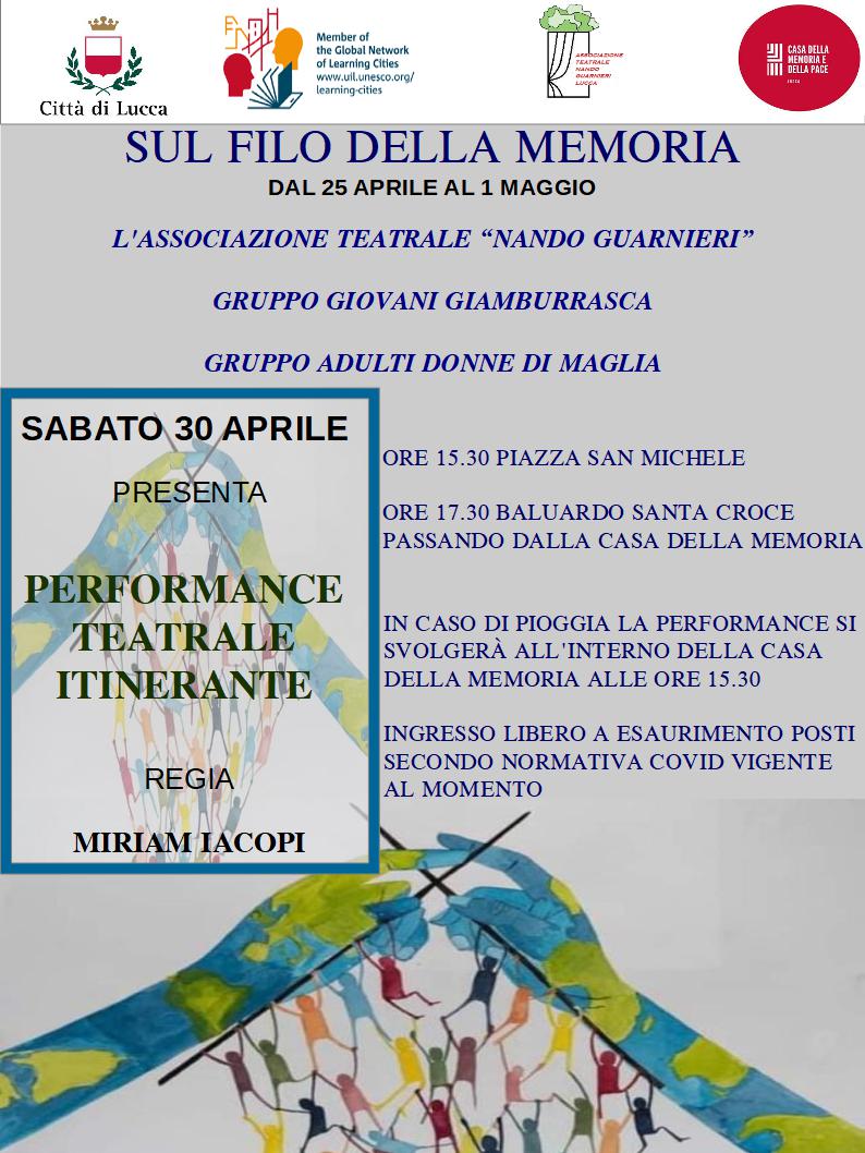 Sabato 30 aprile ore 15.30 partenza da Piazza S.Michele. Attraverso le strade di Lucca fino alla Casa della memoria e della pace. L'Associazione Teatrale Guarnieri, nell'ambito delle celebrazioni del 25 aprile presentate dal comune di Lucca, assessorato alla Memoria Storica, incontra il territorio con una performance itinerante che vede protagonisti Giovani Studenti delle Scuole Superiori di Lucca e un gruppo di donne che hanno deciso di chiamarsi “Donne di maglia”.