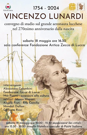 Una mostra, un convegno e un annullo filatelico, il tutto dedicato all’aeronauta lucchese Vincenzo Lunardi nel 270esimo anniversario dalla nascita. E’ questa l’iniziativa promossa dal Comune di Lucca insieme al Museo del Castagno e alla Fondazione Antica Zecca di Lucca per sabato prossimo, 18 maggio, nella sede della casermetta San Donato. Al mattino, alle 10.00, sarà aperta la mostra che raccoglie cimeli e documenti legati all’aeronauta la cui fama è legata indissolubilmente al volo attraverso il pallone aerostatico a idrogeno. Nel pomeriggio, a partire dalle 15.30 fino alle 190.00 ci sarà l’annullo filatelico. A partire dalle 16.30 si svolgerà il convegno che andrà ad indagare questa affascinante figura del Settecento europeo che per le sue imprese e per gli studi compiuti è considerato una delle più importanti personalità nella storia dell'aerostatica di tutti i tempi e di tutti i Paesi. La Fondazione Zecca di Lucca e l’amministrazione comunale porteranno i loro saluti, dopo di che interverranno nel dibattito alcuni conoscitori della figura di Vincenzo Lunardi: Marco Majrani, esperto di aerostatica di fama nazionale; Angelo Frati (presidente del Museo del Castagno) e la professoressa, esperta di ricerca storica e d’archivio Rita Camilla Mandoli Dallan, che nel 2008 per la prima volta hanno portato alla luce il vero luogo e la vera data di nascita di Vincenzo Lunardi; Giacomo Ricci, ex preside dell’Itc Carrara di Lucca e già direttore della Fondazione Barsanti e Matteucci, esperto nell’utilizzo dell’idrogeno per gli aerostati e autore dell'annullo filatelico.