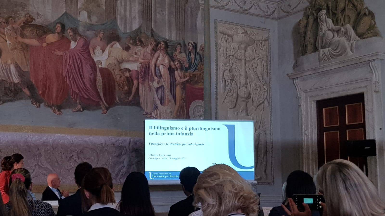 Dopo la lettura di una lettera da parte dell'arcivescovo di Lucca, che ha esteso i suoi saluti e congratulazioni ed espresso la sua convinzione circa l'importanza del latino per cogliere la bellezza dei nostri patrimoni artistici e culturali, è giunto il momento del primo intervento: quello della dottoressa Chiara Facciani, ricercatrice dell'Università per stranieri di Siena, che ha evidenziato i vantaggi del plurilinguismo nella prima infanzia e le strategie per valorizzarlo. "Ci sono sempre molti stereotipi quando parliamo del bilinguismo: che possa creare problemi a scuola, che crei confusione nel cervello del bambino, e che ci siano alcune lingue più utili di altre. Io voglio trasmettere l'importanza del bilinguismo a prescindere" ha esordito. Molti, infatti, i benefici garantiti dal bilinguismo: facilita l'apprendimento di altre lingue, stimola l'elasticità mentale e la capacità di risolvere i problemi, nonché l'intelligenza e la capacità di concentrazione, ha dei vantaggi sull'abilità di memoria del lavoro (soprattutto per le lingue minoritarie e i dialetti, che non hanno un patrimonio scritto), e infine sostiene il fenomeno del decentramento emotivo. "Una persona bilingue ha sempre due lingue attive nel cervello, e deve decidere che lingua usare in base all'interlocutore che ha davanti. Questo la mette in una posizione per cui riesce a mettersi nei panni dell'altro", ha spiegato la dottoressa.