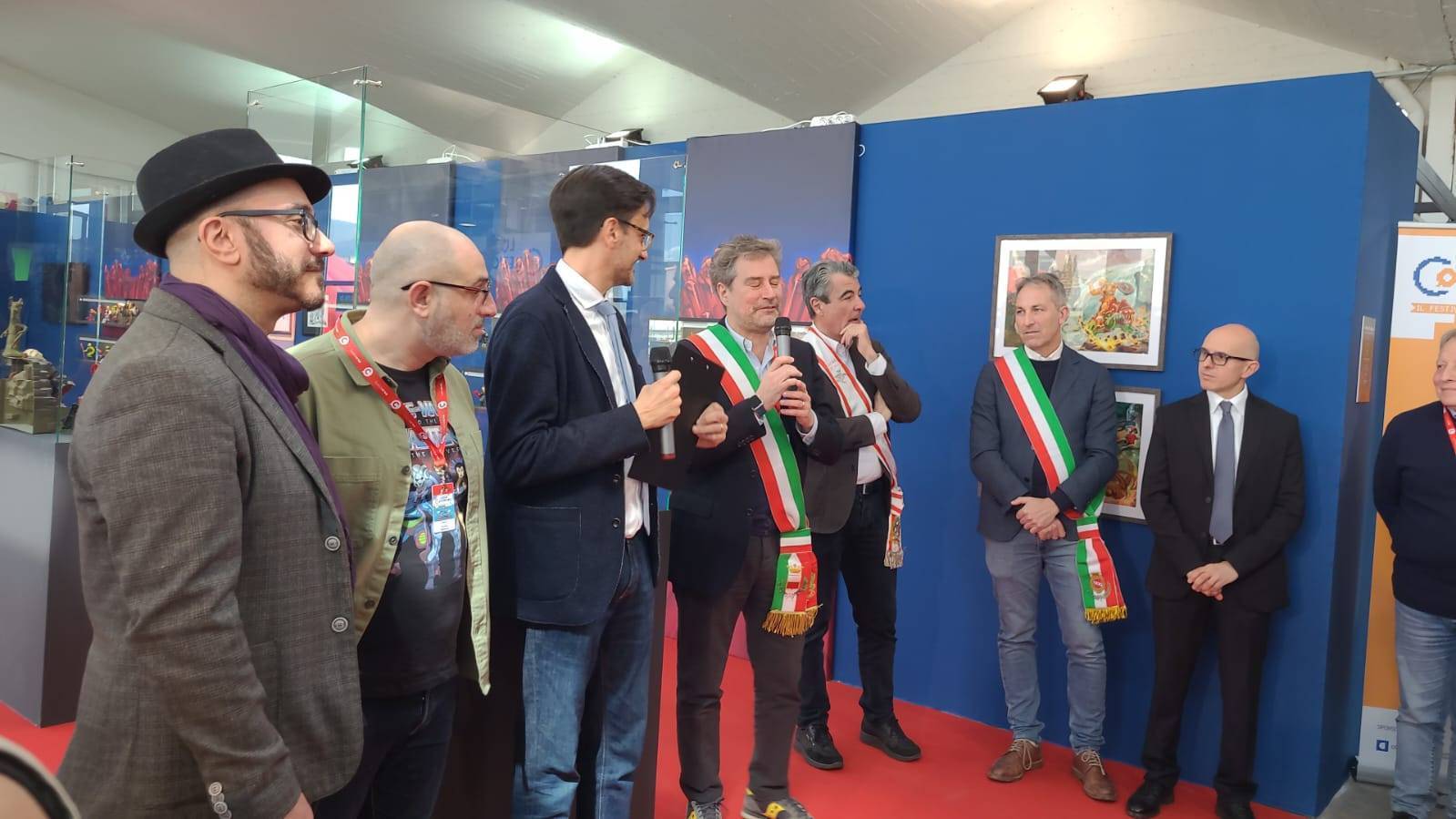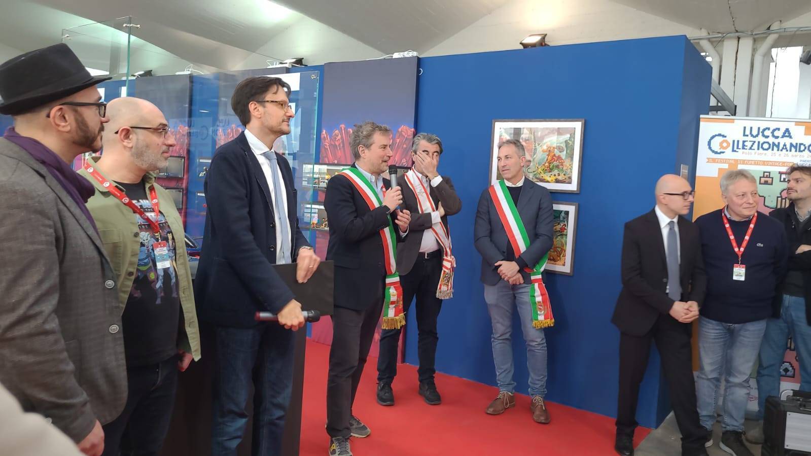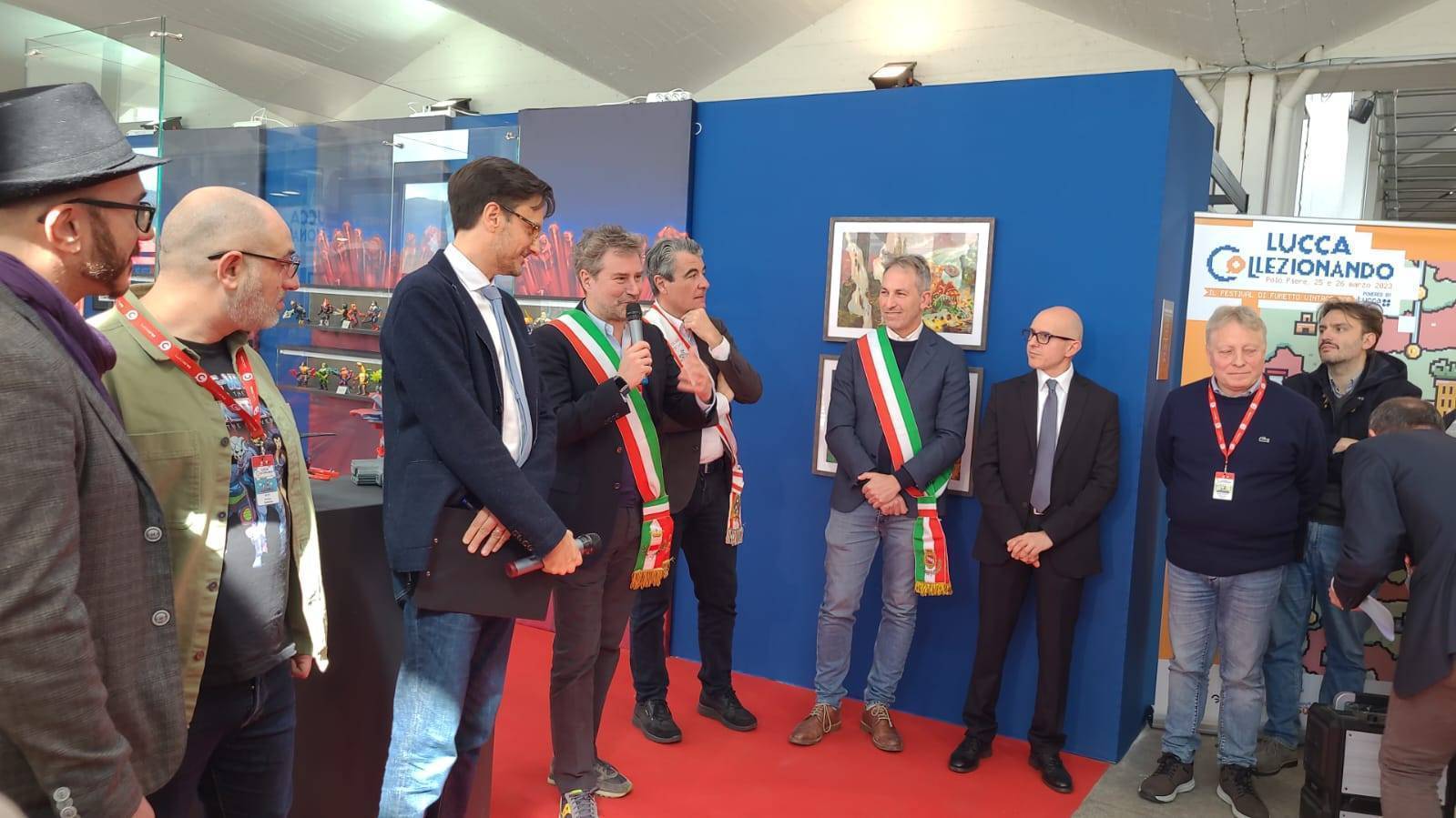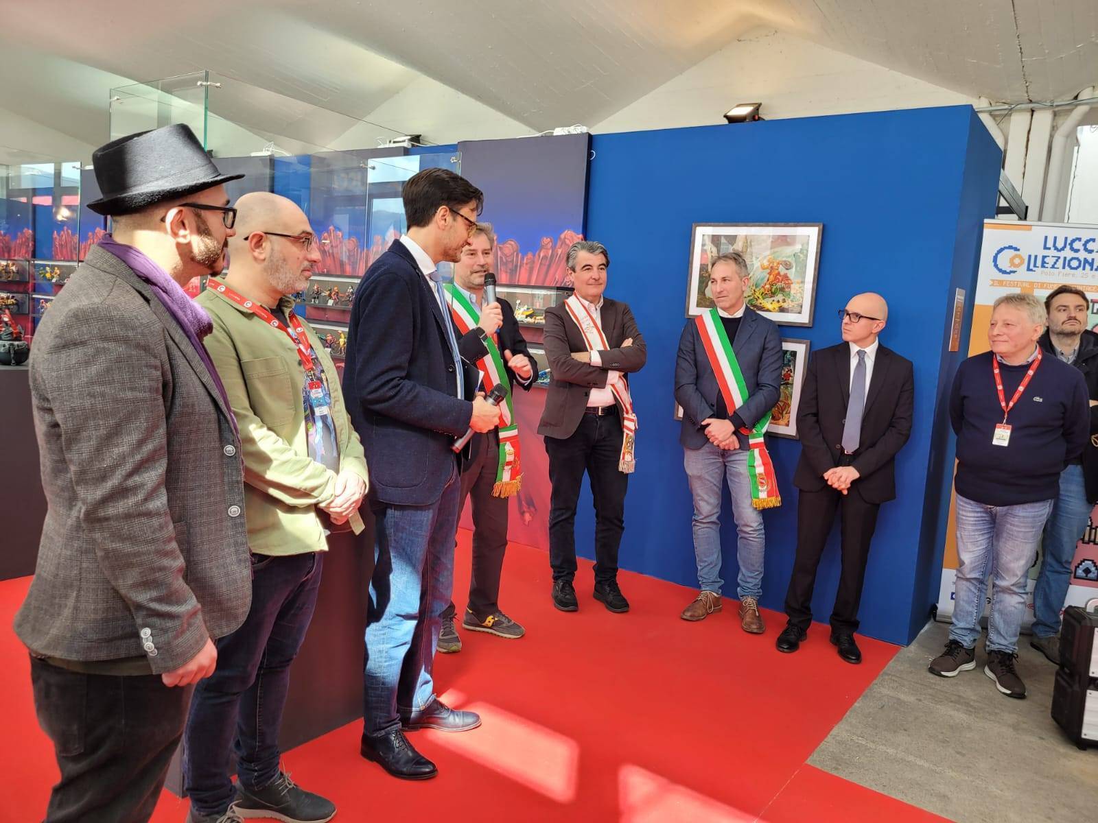 La parola è poi passata ad Andrea Favilla, vicesindaco di Camaiore, in occasione della nuova collaborazione sorta fra le due amministrazioni comunali, per cui l'Associazione tappeti di segatura di Camaiore ha realizzato una sua rendizione del logo di Lucca Collezionando. "Quella dei tappeti di segatura è una tradizione importante, che ogni hanno ha luogo in occasione del Corpus Domini- ha spiegato il vicesindaco- Siamo onorati di poter partecipare in questo modo".