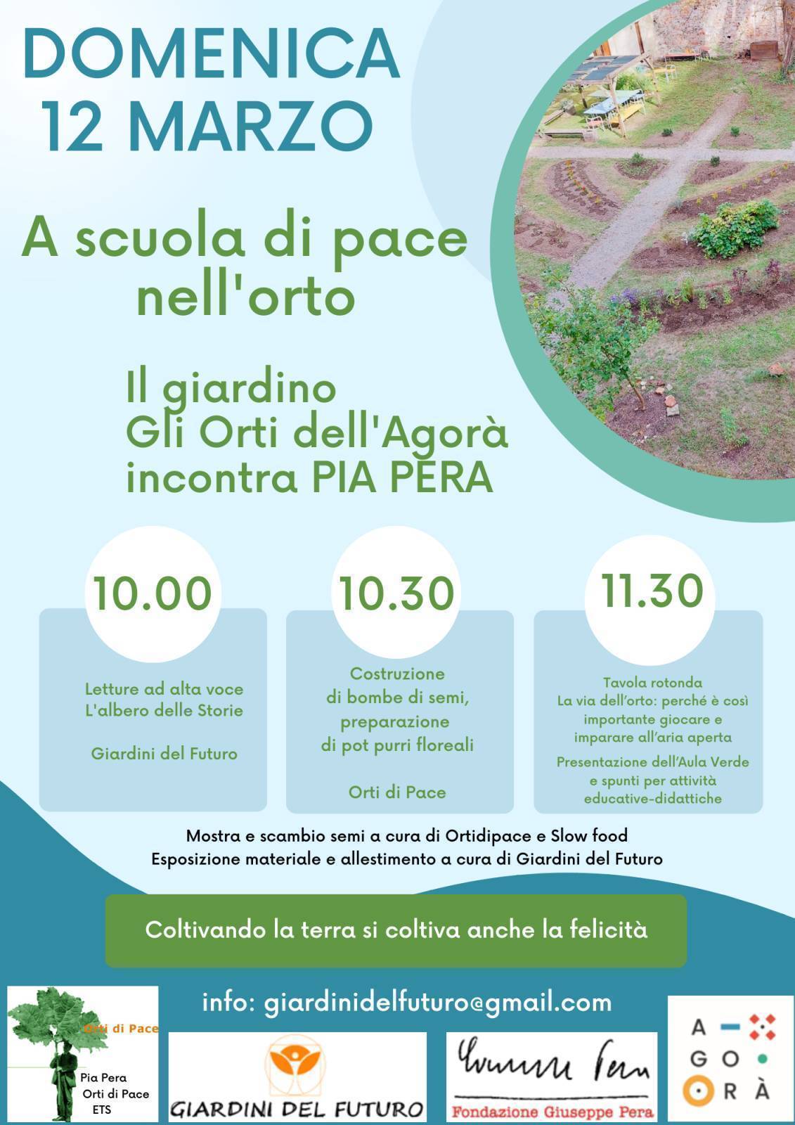 I temi intorno alla "cultura dell'orto e del giardino in senso lato, come luogo ideale per intrecciare tutta una serie di scambi con la natura, l'ambiente e la comunità e per coltivare la pace interiore" saranno declinati in un programma che apre alle ore 10 con "Letture ad alta voce e letture animate per bambini e ragazzi (0-14)"; prosegue alle 10,30 con "Laboratori per bambini e ragazzi" a cura di Nadia Nicoletti, coordinatrice del portale www.ortidipace.org che guiderà nella costruzione di bombe di semi e preparazione di pot purri foreali e si concluderà con la Conversazione sotto la Pergola "La via dell'orto: perché è così importante giocare e imparare all'aria aperta".