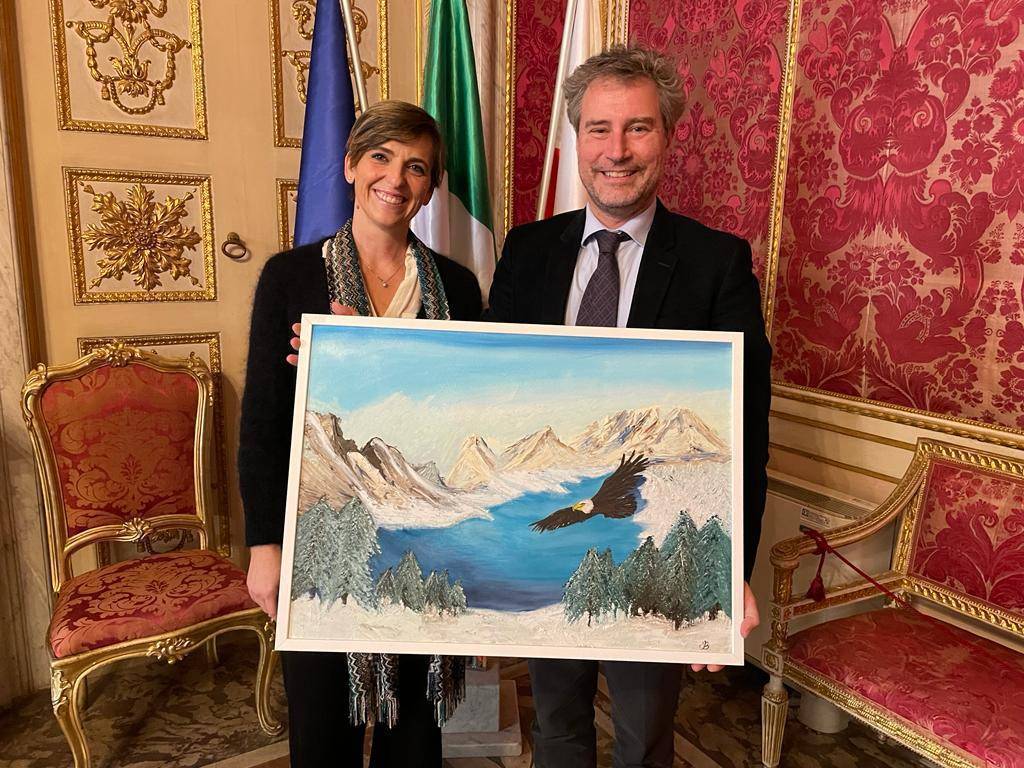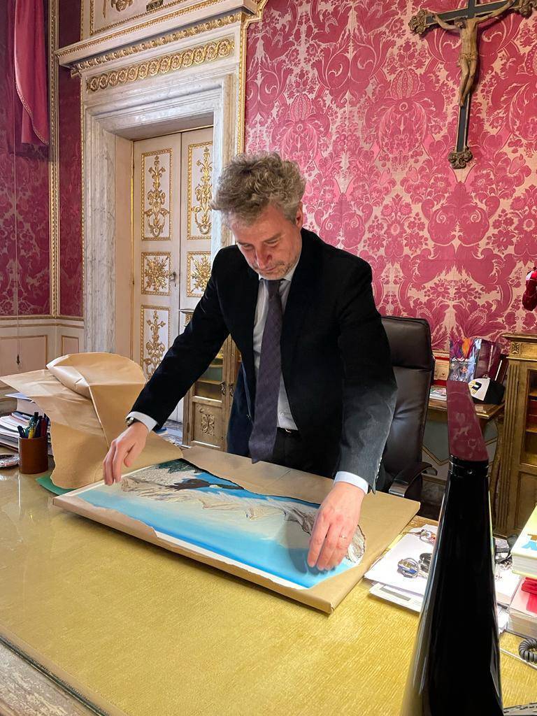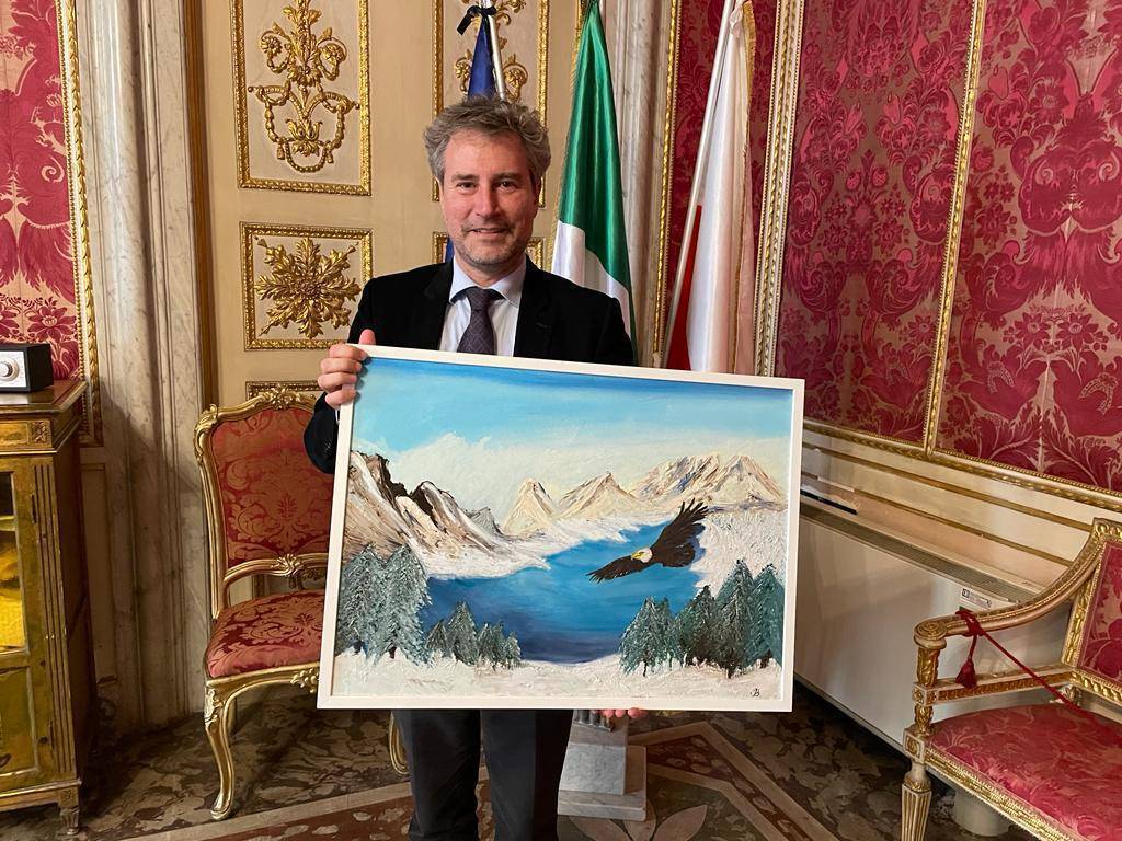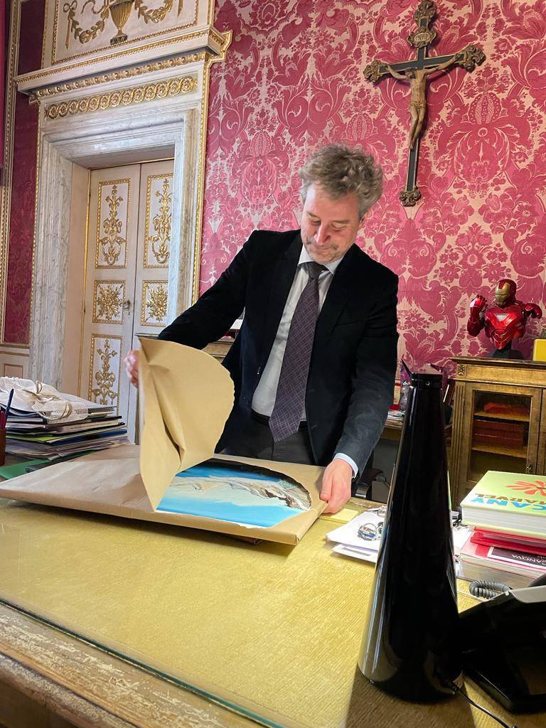 Il primo cittadino ha ricevuto la coppia nella sua stanza a palazzo dei Bradipi (già Orsetti) e ha anche ricevuto in dono dalla pittrice, un quadro intitolato Freedom. Bettaccini è anche presidente dell'associazione Ucai (Unione Cattolica Artisti Italiani).
