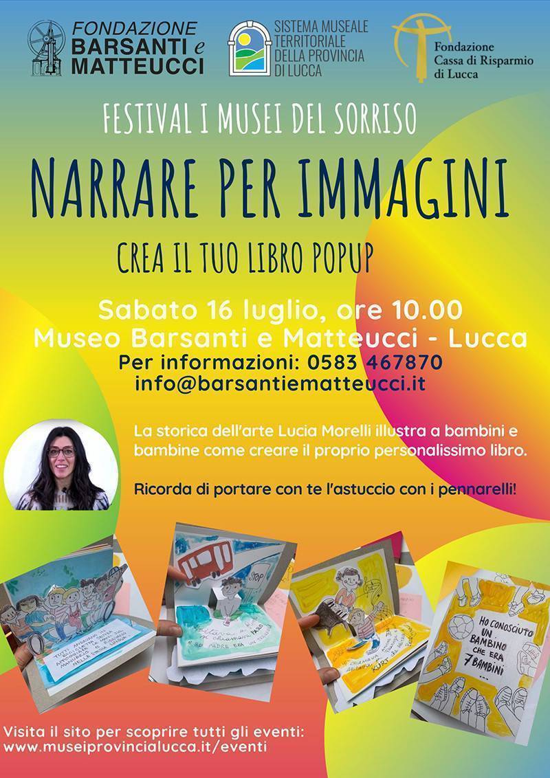 Il primo appuntamento è sabato 16 luglio 2022 alle 10 ed è rivolto ai più piccoli. Si tratta del laboratorio didattico-artistico "Narrare per immagini. Crea il tuo libro PopUp con la storia che vuoi tu" e si svolge al Museo Barsanti e Matteucci di Lucca a cura della storica dell'arte Lucia Morelli che, grazie al racconto di Gianni Rodari "Uno e sette", proporrà a bambine e bambini la creazione di una propria storia da raccontare con la tecnica del libro PopUp. Il laboratorio è indirizzato all'età 6-12 anni; i partecipanti sono invitati a portare il proprio astuccio con i colori.