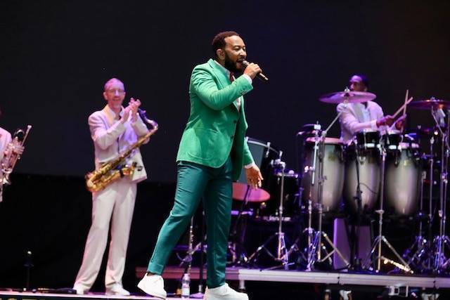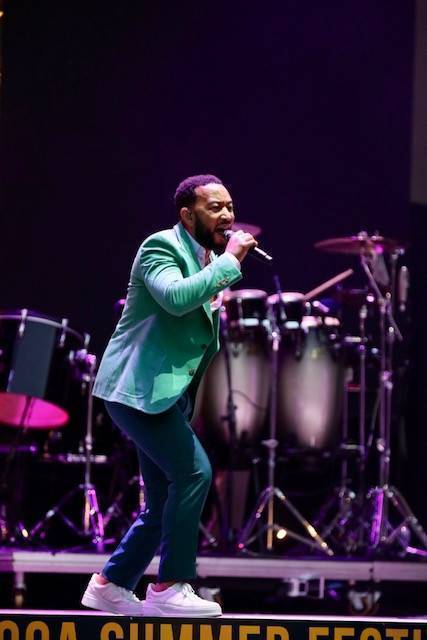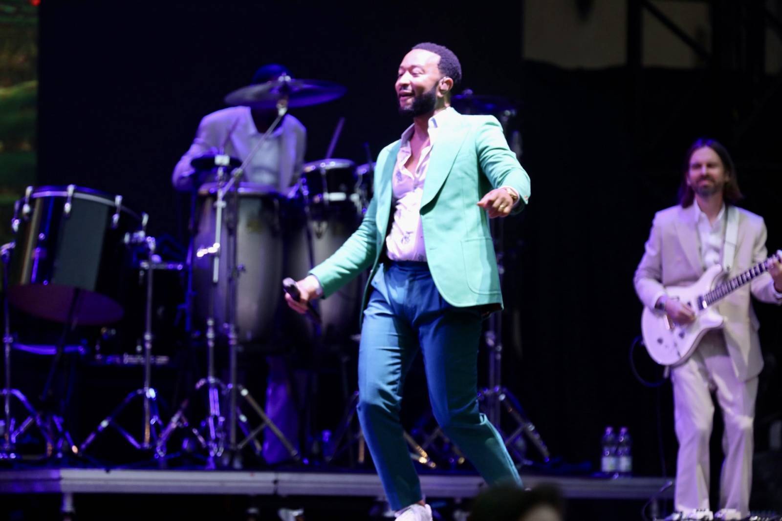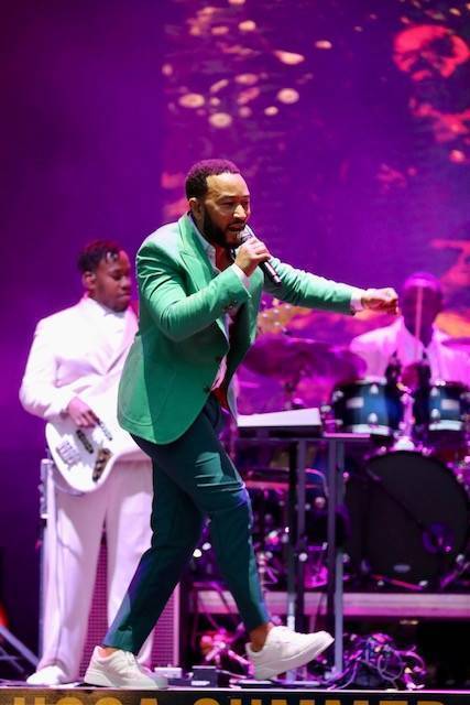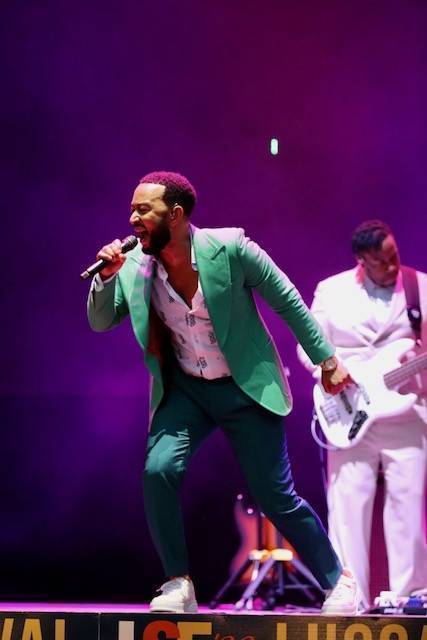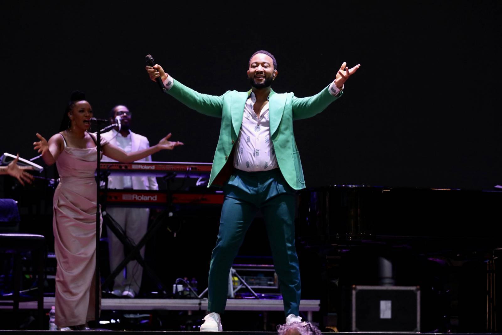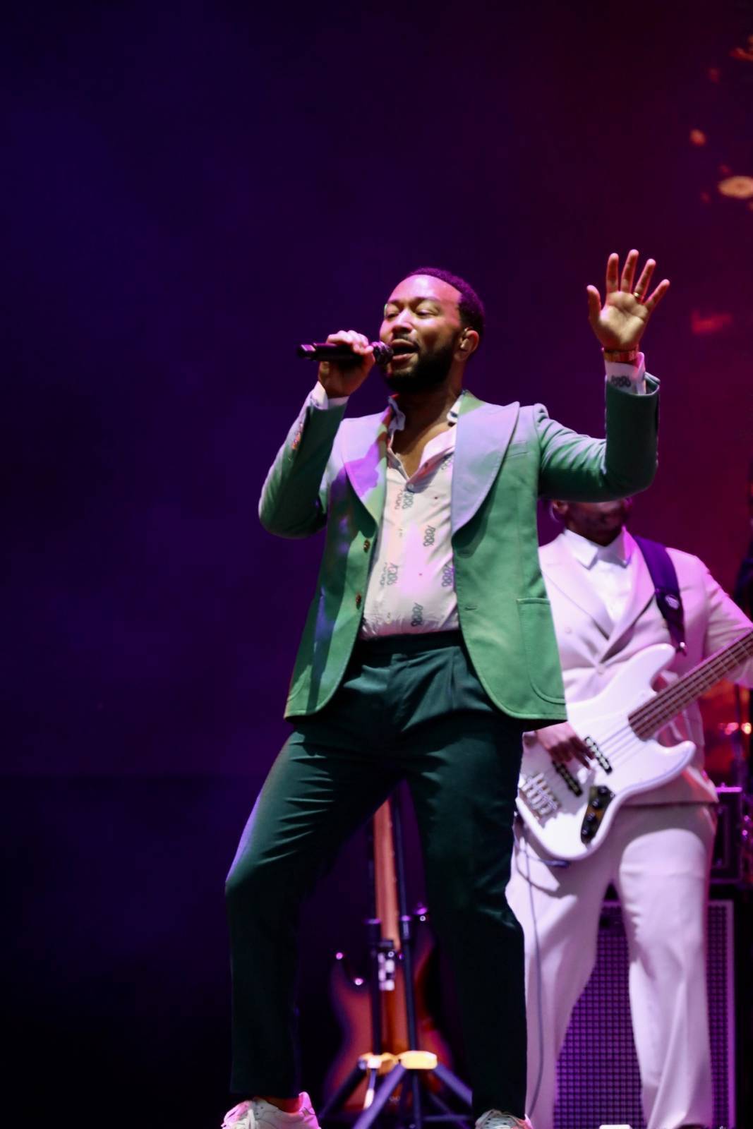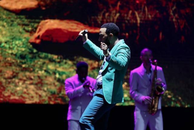 Legend non è stato puntuale, di più: alle 20.58, quindi con due minuti di anticipo, erano già calate le luci sul palcoscenico. Tutti vestiti rigorosamente di bianco i musicisti, eccetto le due coriste, in abito rosa, e poi... Beh, e poi lui, John Legend, impeccabile con un vestito verde smeraldo, un po' di pancetta (che si dice alle donne piaccia) e addosso un paio di scarpe sportive: un mix di stile ed eleganza ineguagliabile.