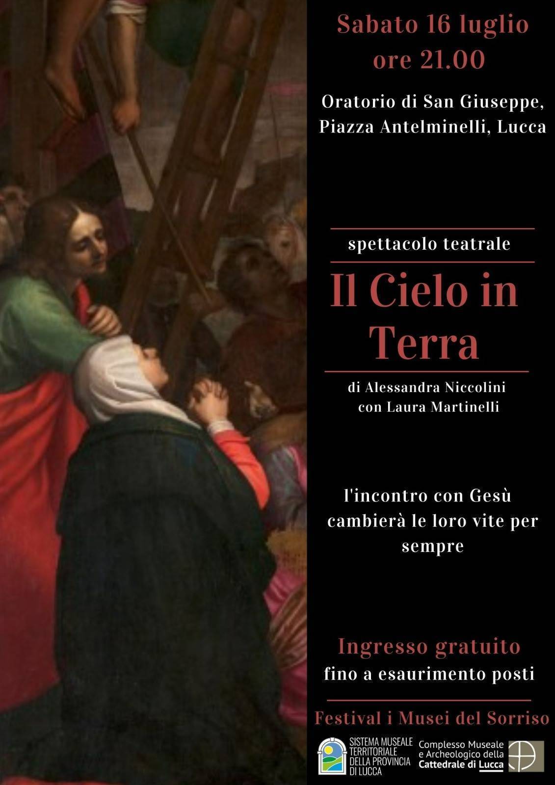 Prosegue il Festival I Musei del Sorriso con lo Spettacolo Teatrale il Cielo in Terra, Sabato 16 luglio ore 21, all’Oratorio di San Giuseppe di piazza Antelminelli, organizzato dal Complesso Museale e Archeologico della Cattedrale di Lucca.
