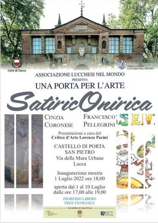 L’Associazione “lucchesi nel mondo”, presenta il progetto “Una porta per l’Arte” con la mostra “SatiricOnirica“ con gli artisti locali, la pittrice Cinzia Coronese e lo scultore vignettista Francesco Pellegrini. L’evento si terrà presso la sede Lucchesi nel Mondo nel Castello di Porta S. Pietro sulle mura urbane a partire dall’1 al 10 luglio.