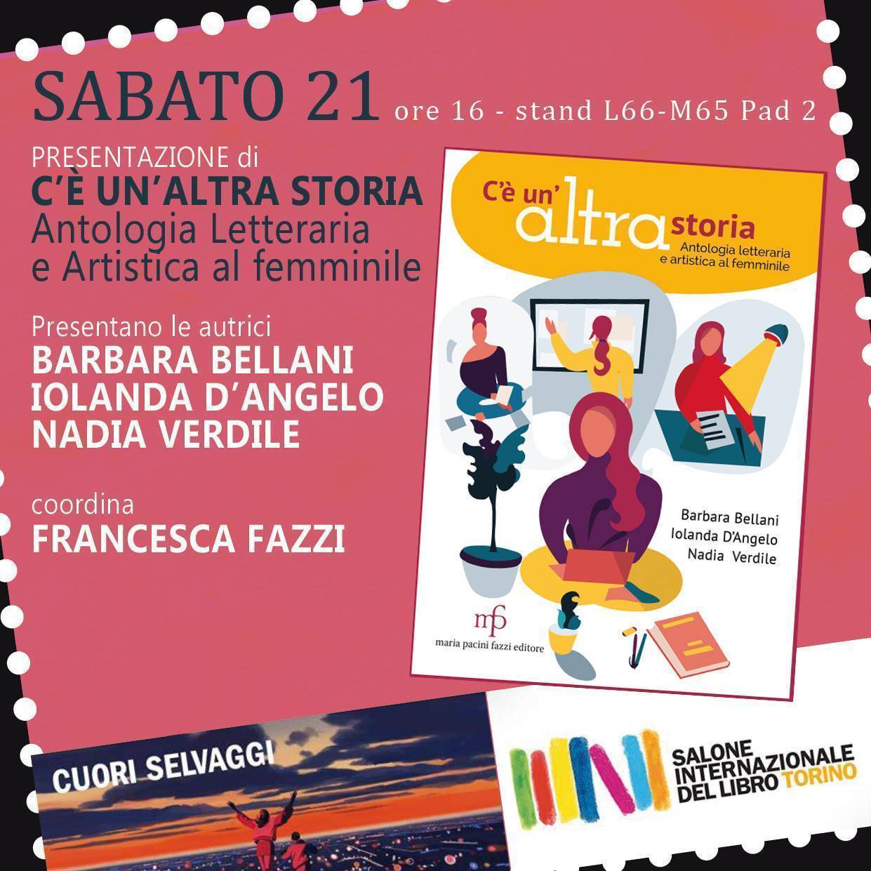 Due gli appuntamenti in programma con due focus tematici: dopo la presentazione di sabato 21 maggio alle 16 dell'Antologia letteraria e artistica tutta al femminile “C'è un'altra storia”, con introduzione dell'Assessora all'Istruzione e alle Pari opportunità della Regione Toscana Alessandra Nardini. Un volume nato per proporsi anche come saggio per gli insegnanti volto a far scoprire l'universo femminile delle artiste e delle scrittrici dal Medioevo ai giorni nostri. Saranno presenti le tre autrici Nadia Verdile (tra l'altro curatrice della Collana Italiane), Iolanda D'Angelo e Barbara Bellani. Domenica pomeriggio appuntamento con l'arte e la Collana ALT, iniziativa nata all'interno del gruppo di lavoro della Fondazione Ragghianti: è affidato all'attrice/autrice torinese Anna Abate il compito di introdurre e coordinare gli interventi delle autrici del volume Federica Chezzi e Angela Partenza e dell'autore dell'apparato illustrativo Francesco Pavignano.