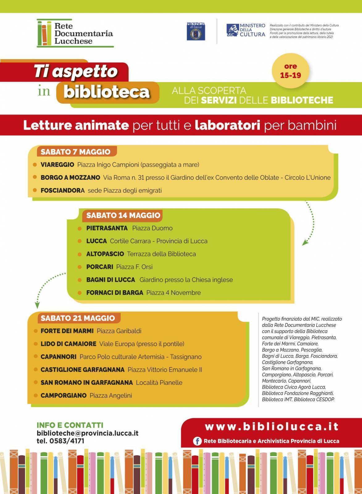 Il programma: sabato 7 maggio "Ti aspetto in biblioteca" sarà in piazza Campioni (passeggiata a mare) a Viareggio; poi in via Roma presso il Giardino dell'ex Convento delle Oblate - Circolo L'Unione a Borgo a Mozzano; e nella Piazza degli emigrati a Fosciandora.