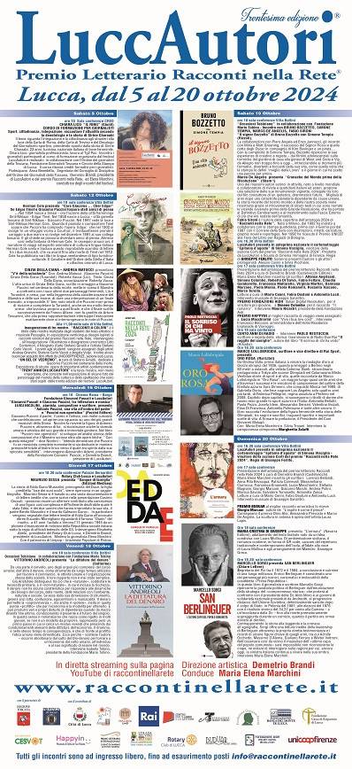 Correva l’anno 1994 quando Demetrio Brandi ebbe l’intuizione di creare una manifestazione, dal nulla, di incontri letterari che coniugassero cultura, arte, poesia e spettacolo. Sono passati trent’anni e l’emozione nella scelta degli ospiti, dei contatti con le case editrici e, ancora di più, con gli autori è rimasta, come allora, intatta. Si è tenuta questa mattina a Palazzo Orsetti, nel corso di una conferenza stampa a cui erano presenti, in rappresentanza del Comune di Lucca Remo Santini e Mia Pisano, assessori al Turismo ed alla Cultura, la presentazione della 30^ edizione della rassegna LuccAutori, a cui sarà abbinato, come accade da ormai 23 anni, il Premio letterario “Racconti nella rete”. “È un grande piacere, e lo facciamo con gioia, – ha esordito Mia Pisano – presentare questa nuova edizione del Festival di LuccAutori. Attraverso i libri possiamo trattare argomenti che, nella vita di tutti i giorni, difficilmente riusciamo ad affrontare. Per Lucca è un appuntamento immancabile nei mesi di settembre ed ottobre”. I luoghi della rassegna di quest’anno saranno Palazzo Bernardini e Villa Bottini, per quanto riguarda Lucca, ma anche Barga (al Cinema Roma con la “Fondazione Pascoli”), dove si svolgerà, nella mattinata di mercoledi 16 ottobre, un interessantissimo incontro sul tema “Giovanni Pascoli e Giacomo Puccini, tra letteratura e musica”. Lucca, in questo anno ricchissimo di eventi, sarà ancora protagonista con questo appuntamento letterario che la collocherà, per l’ennesima volta, al centro del panorama culturale nazionale. “Il connubio fra LuccAutori e la città – ha commentato Remo Santini – grazie al grandissimo lavoro del direttore artistico Demetrio Brandi, è meraviglioso ed in linea con quello che questa amministrazione sta cercando di fare. Manifestazioni di altissima qualità che possano attirare l’attenzione di un pubblico che scopra gli autori ma, al tempo stesso, anche le bellezze della nostra città e di tutto il nostro territorio”. A Villa Bottini, il 19 e 20 ottobre, saranno premiati i 25 vincitori della 23^ edizione del premio “Racconti nella Rete” e la vincitrice della sezione cortometraggi. Grandi ospiti si alterneranno durante le giornate della manifestazione tra cui Bruno Bozzetto, Vittorio Andreoli, Marco Lollobrigida e Margherita Zalaffi, ma anche Marcello Sorgi, Paolo Restuccia, Maurizio Sessa e Marco De Angelis. “Sarà un’edizione in cui non poteva mancare, nell’intero contesto – dice Demetrio Brandi – una mostra dedicata a Giacomo Puccini dal titolo “Un bel di vedremo”, a cura di Stefano Giraldi, con disegnatori importanti che, da sabato 12 ottobre a domenica 20, metteranno in mostra opere dedicate al grande maestro”. Tra i riconoscimenti che verranno assegnati durante il Festival LuccAutori ci saranno il “Premio Buduar”, per il miglior racconto umoristico, ed il “Premio Happyin” per il miglior racconto di viaggio oltre al “Premio Fondazione AIDR” che sarà assegnato al vincitore più giovane. In occasione della presentazione di questa nuova edizione di LuccAutori, Domenico Brandi ha omaggiato tutti i presenti con l’edizione “Racconti nella Rete 2024”, a sua propria cura, che raccoglie i racconti dei 25 scrittori che hanno vinto la selezione dell’edizione 2024, e “l’Antologia 2024” in cui sono racchiuse trent’anni di immagini dei protagonisti di questa storica rassegna con l’illustrazione, in copertina, ad opera di Fabio Sironi. La rassegna si avvale di collaborazioni importanti tra cui la RAI, la Fondazione Mario Tobino, il Rotary Club Lucca, la Fondazione Giovanni Pascoli, la Fondazione Cassa di Risparmio di Lucca, la Fondazione Banca del Monte di Lucca e Unicoopfirenze. Per tutte le informazioni e per essere aggiornati sul vasto programma è possibile consultare il sito www.raccontinellarete.it, contattando la mail