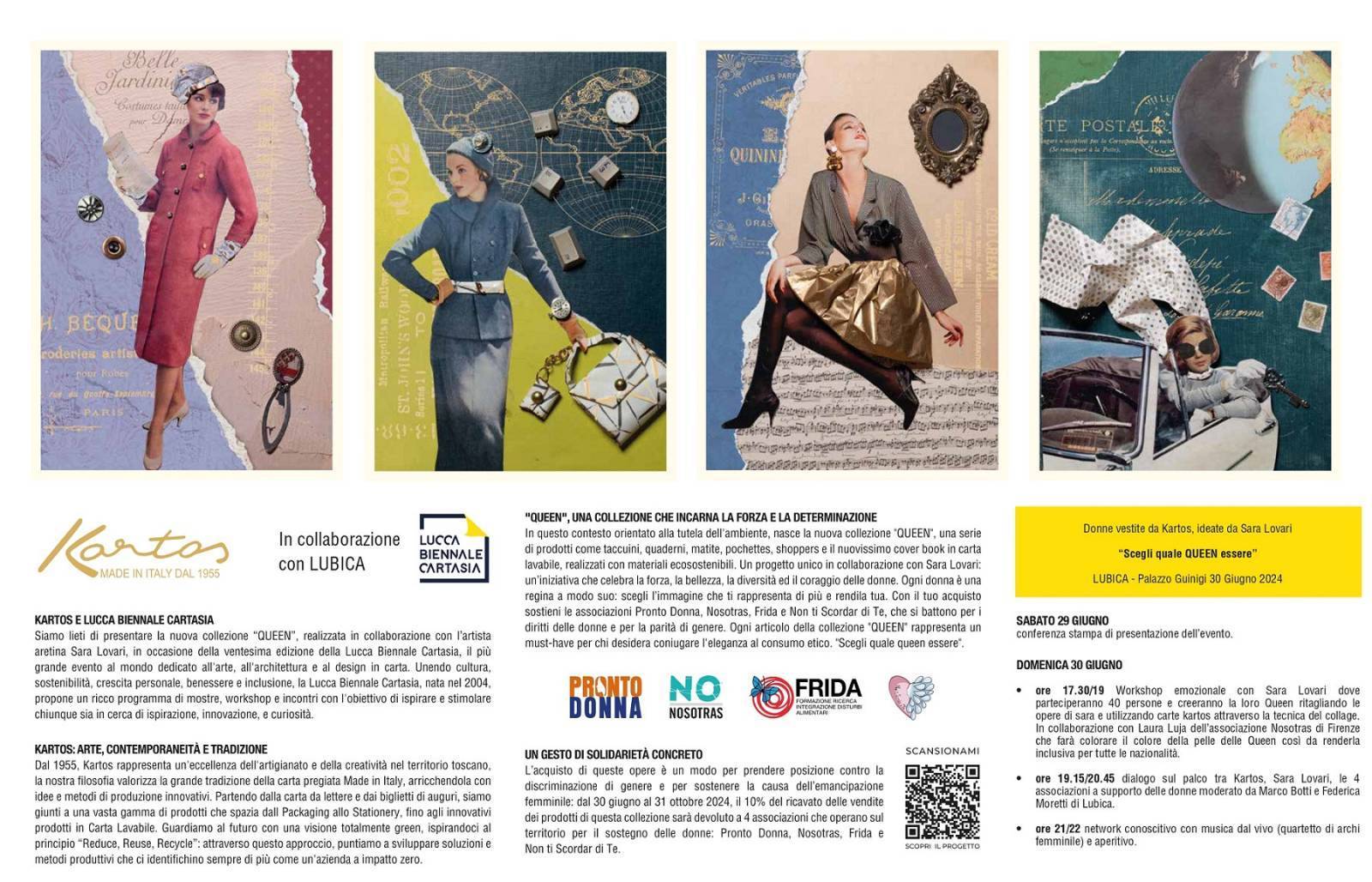 Lo spirito di innovazione e visione del futuro che anima Kartos, dal 1955 icona di stile, si sposa con un'ottica totalmente "green", rappresentata dalla logica "reduce, reuse, recycle". In questo contesto nasce "Queen", la nuova collezione firmata da una delle più apprezzate artiste toscane della sua generazione, Sara Lovari, formata da prodotti in carta lavabile come taccuini, quaderni, matite, pochettes, shoppers e il nuovissimo book.